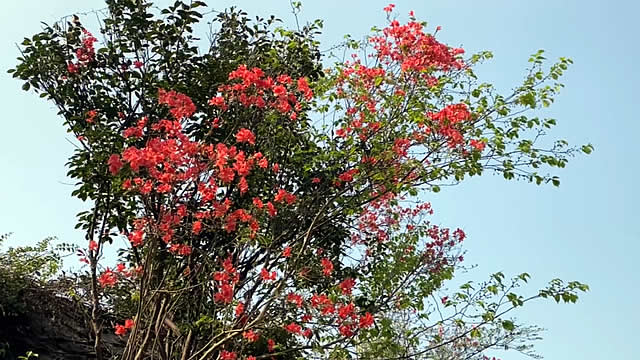 在黄溪冲村旅游观光园里,漫山遍野的红杜鹃争奇斗艳、绮丽多姿,在阳光的映衬下,殷红似火,染红了群山,映红了绿水,引得观光游客流连忘返。