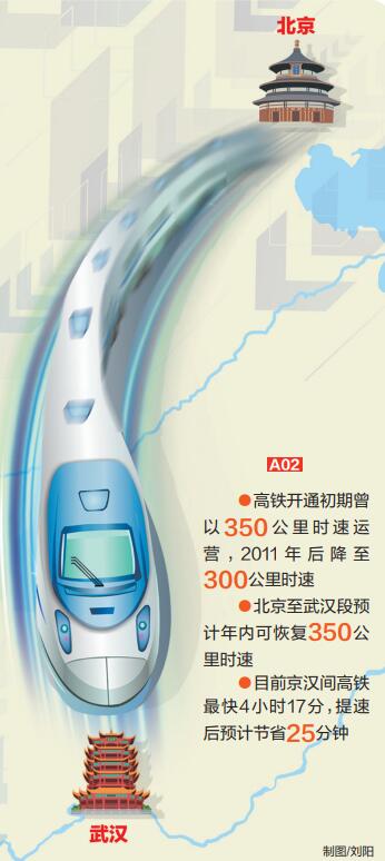 2009年,武广高铁开通初期均以350公里/小时速度运营,2011年后时速降至300公里。多年来,京广高铁恢复至设计标准时速350公里“达标运行”的呼声一直不断。达标工程完成后,京广高铁“复兴号”列车将以350公里的时速运营,北京至武汉旅行时间将进一步压缩。