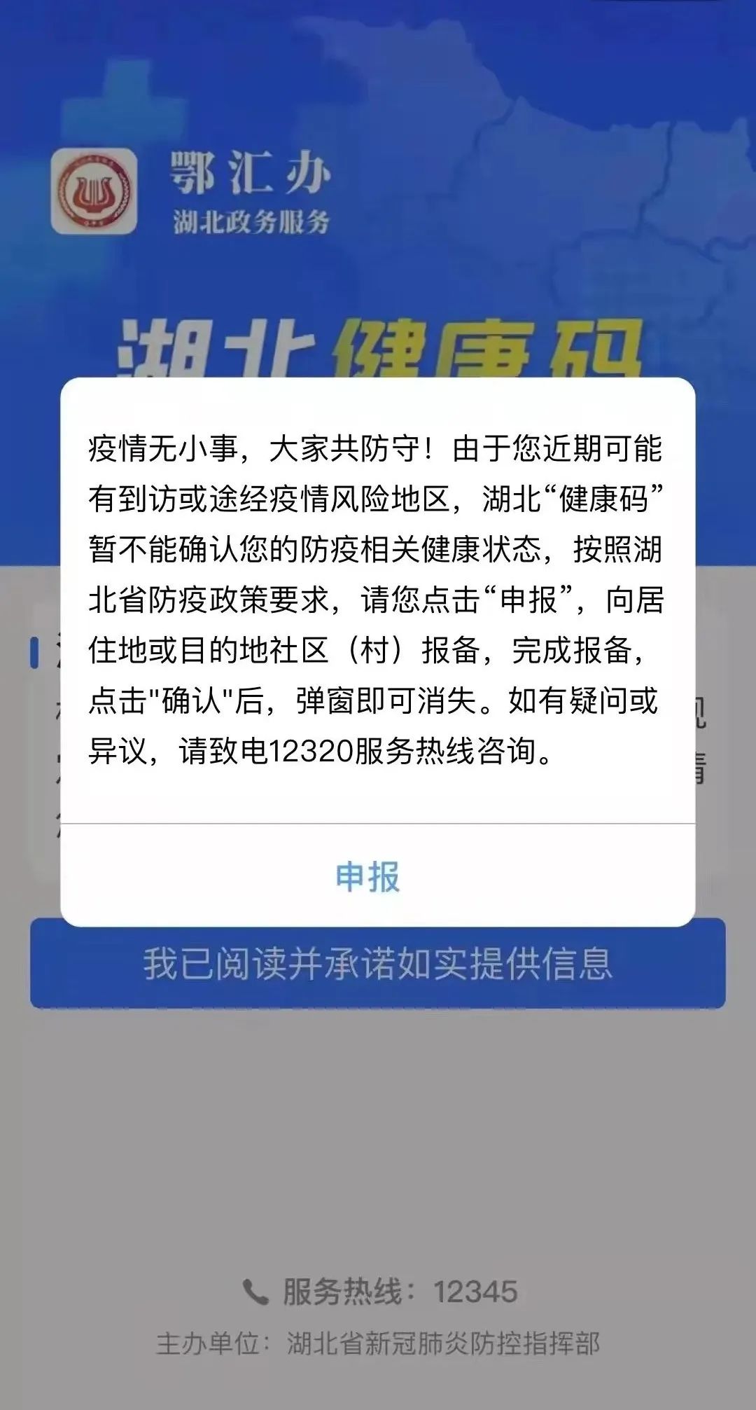 来(返)鄂人员打开“湖北健康码”如果收到弹窗提示,可点击下方“申报”按钮。