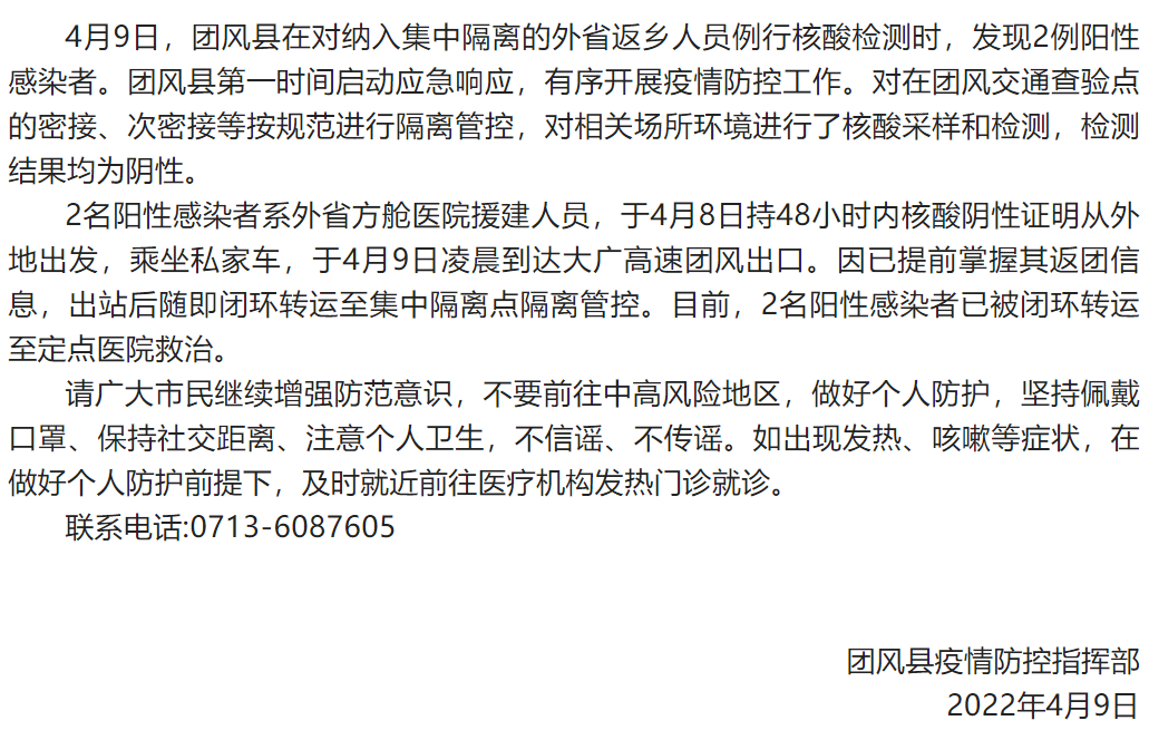 团风县在闭环管理中发现2例外省返乡阳性感染者