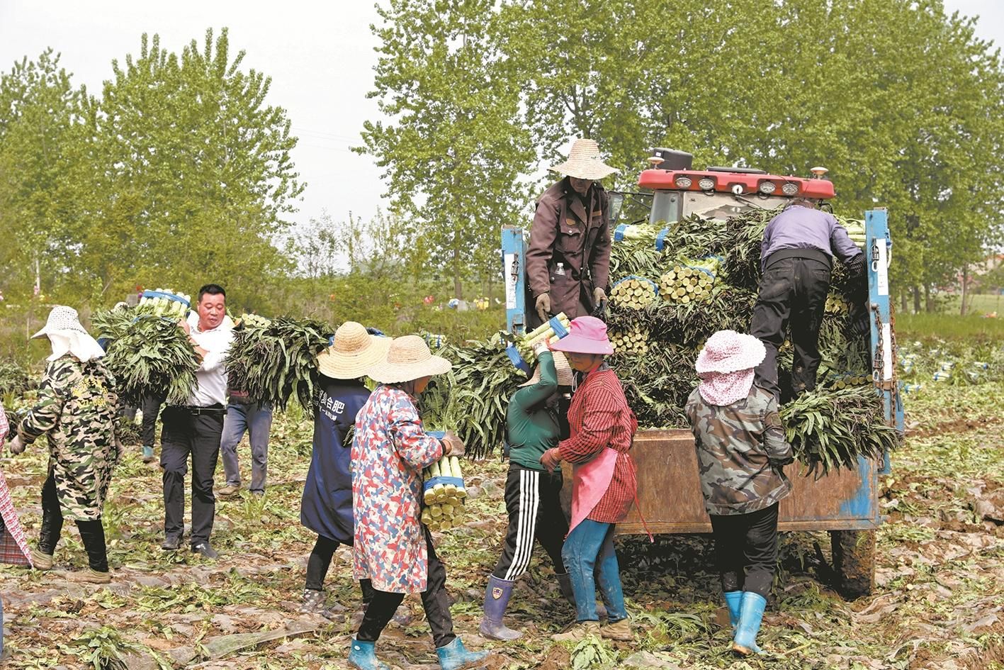 天门市鸿远马铃薯专业合作社理事长梁红清,昨日也调集20多名工人采摘蔬菜。他亲自参加搬运队伍,拎上打好捆的莴苣往车上递。
