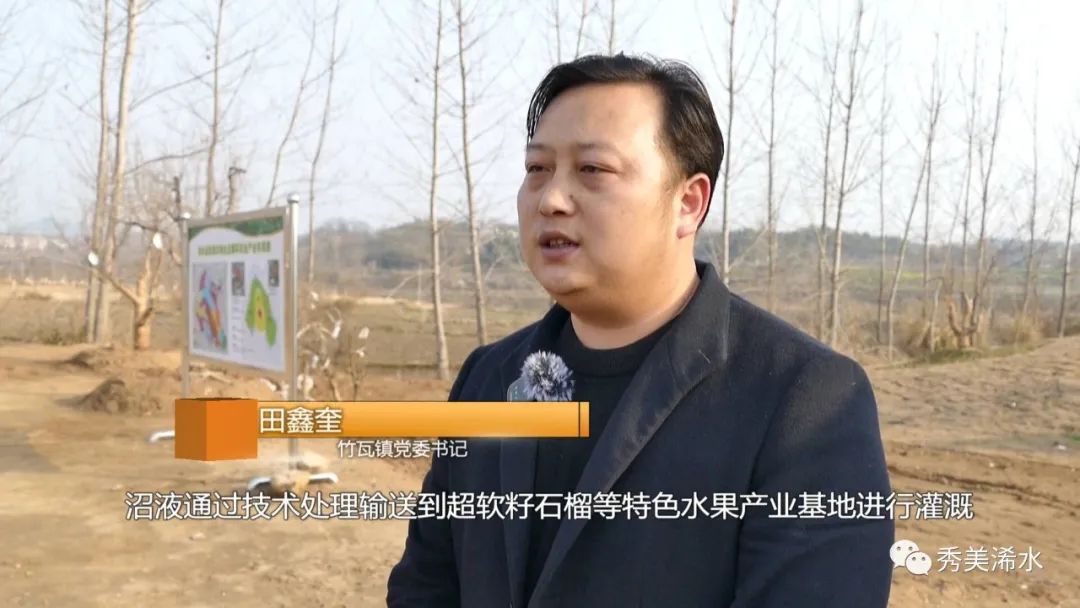 竹瓦镇党委书记 田鑫奎:市场主体是由养殖业转变为种植业的一个典型代表。项目将养殖场产生的沼渣制作成有机肥,沼液通过技术处理输送到超软籽石榴等特色水果产业基地进行灌溉。