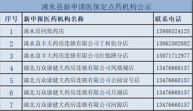根据《黄冈市基本医疗保险医药机构协议管理办法》相关规定,对申报的7家定点医药机构进行了定点资格评定。经过严格评定,浠水县同致药房等7家医药机构被确定为县内基本医疗保险定点医药机构,名单如下: