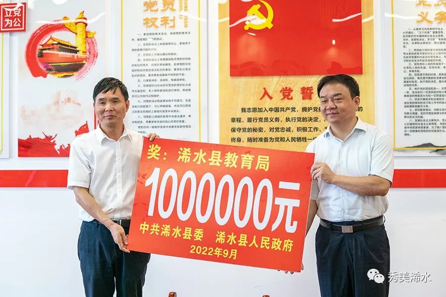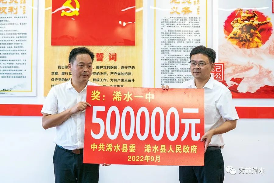 会上,付宇向县教育局颁发高考奖100万元,陈正红向浠水一中颁发高考贡献奖50万元。