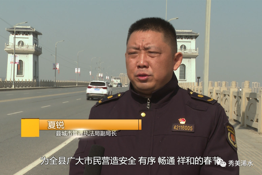 县城市管理执法局副局长 夏锐:春节将至,我们城市管理执法局对城区开展保卫生、保秩序、保畅通、保安全四保工作,为全县广大市民营造安全、有序、畅通、祥和的春节。