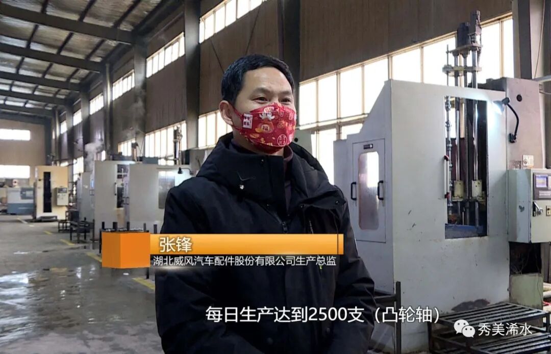 湖北威风汽车配件股份有限公司生产总监 张锋:公司在春节期间不停工不停产,满负荷生产,每日生产达到2500支凸轮轴,订单充足,元月份订单高达8万支凸轮轴,预计一季度产值在3000万到4000万元之间,公司全体人员加班加点,奋力夺取一季度开门红。(记者:陈广泽)