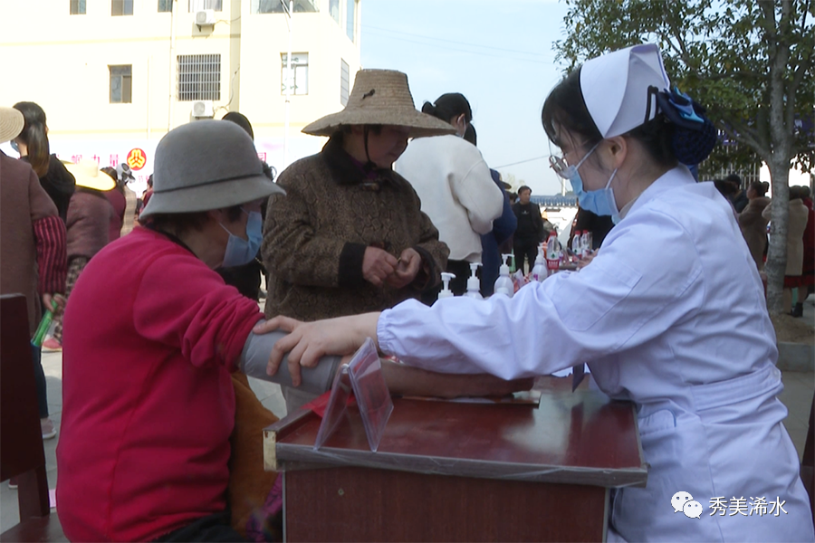 在朱店村村部,10名医务人员免费为村民们义诊,现场检查血糖、检测血压、骨密度等。