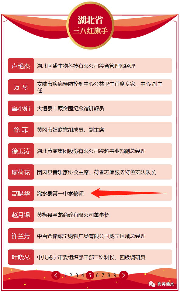 3月7日上午,湖北省各界妇女纪念“三八”国际妇女节113周年暨表彰大会召开,陈淑芬等10名同志被授予“湖北省三八红旗手标兵”称号,江帆等89名同志被授予“湖北省三八红旗手”称号,武汉市中级人民法院民事审判第一庭等50个单位被授予“湖北省三八红旗集体”称号。其中,浠水县第一中学教师高腊华被授予“湖北省三八红旗手”称号。