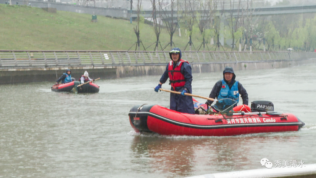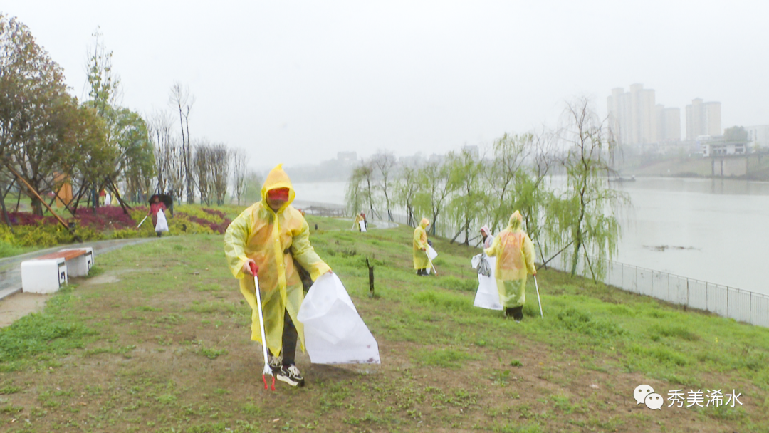 启动仪式后,志愿者们冒雨在浠水河一桥至六桥河流岸线清理垃圾。浠水蓝天救援队的志愿者乘坐皮划艇打捞浠水河的垃圾。