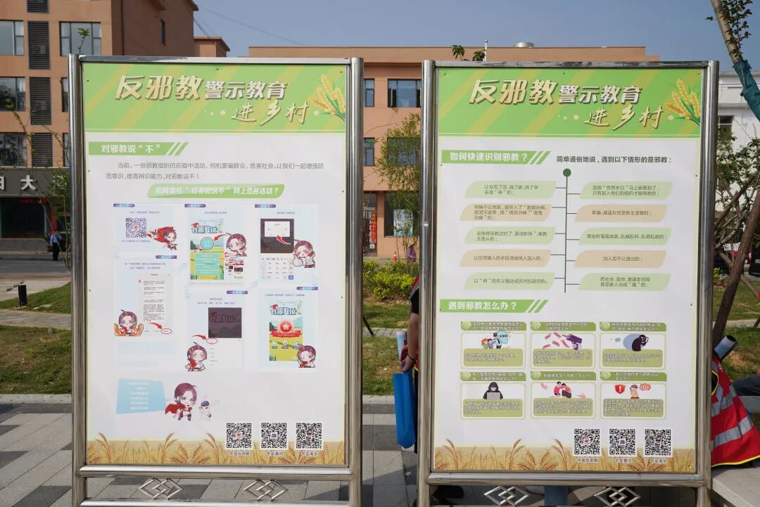 活动现场摆放了反邪教宣传展板、海报和涉案物品,展板上邪教的危害和真实的案例吸引了路过的群众驻足观看。