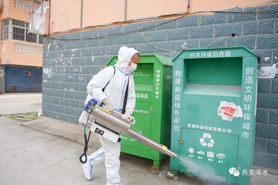 蓝天救援队4名队员携带2台弥雾机、2台喷雾机一字排开,对洪水淹浸区域从下到上进行全覆盖消杀。水退到哪里,环境清理到哪里,消杀灭到哪里,是保障大灾之后无大疫的重要卫生防疫措施之一。