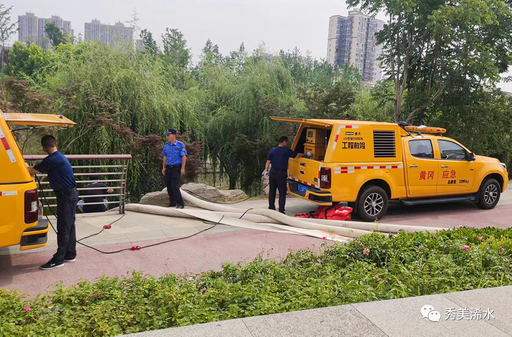 应急队员利用移动泵车等装备进行排涝工作。移动泵车应用于防洪排灌、抗旱抢险、窨井排水、污水排水、紧急抢修排水、无电源供排水等方面,是内涝排险的有力武器。