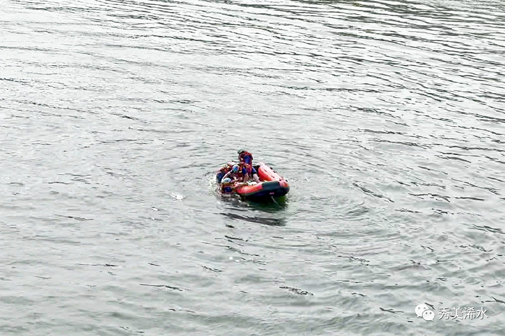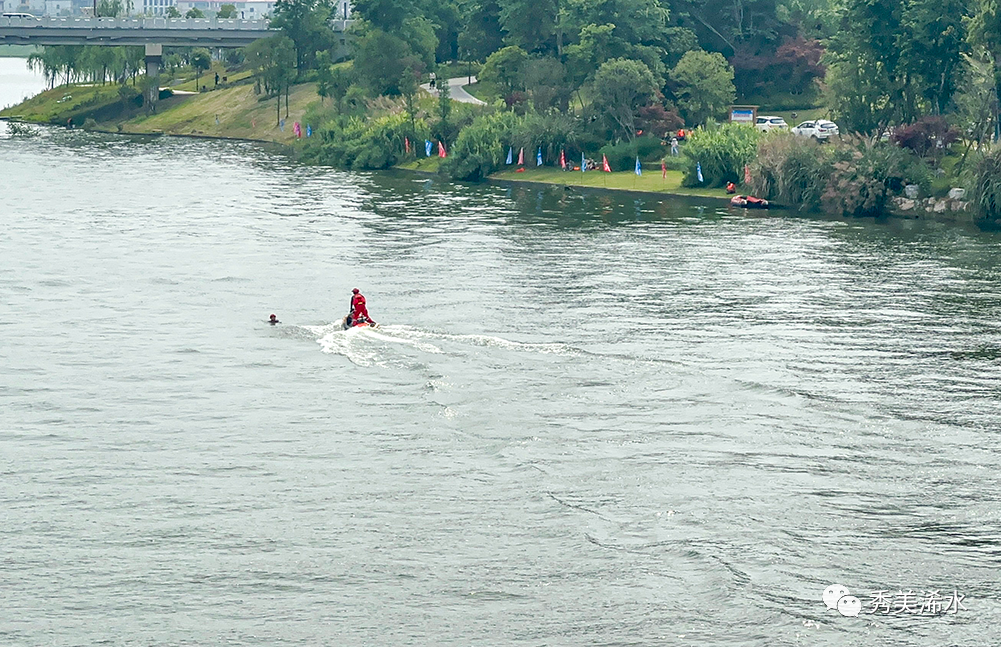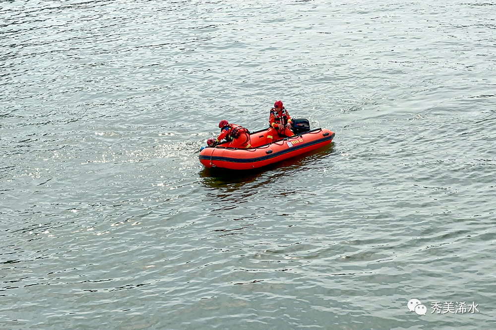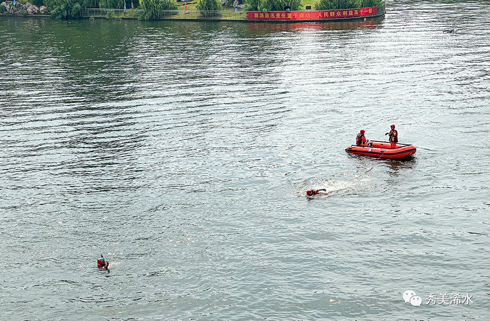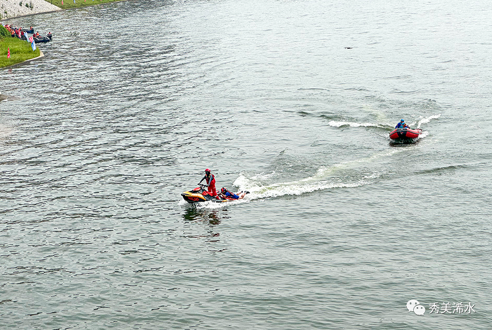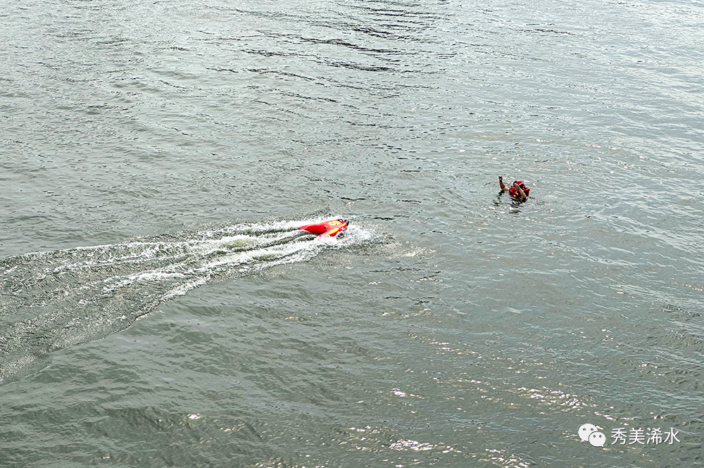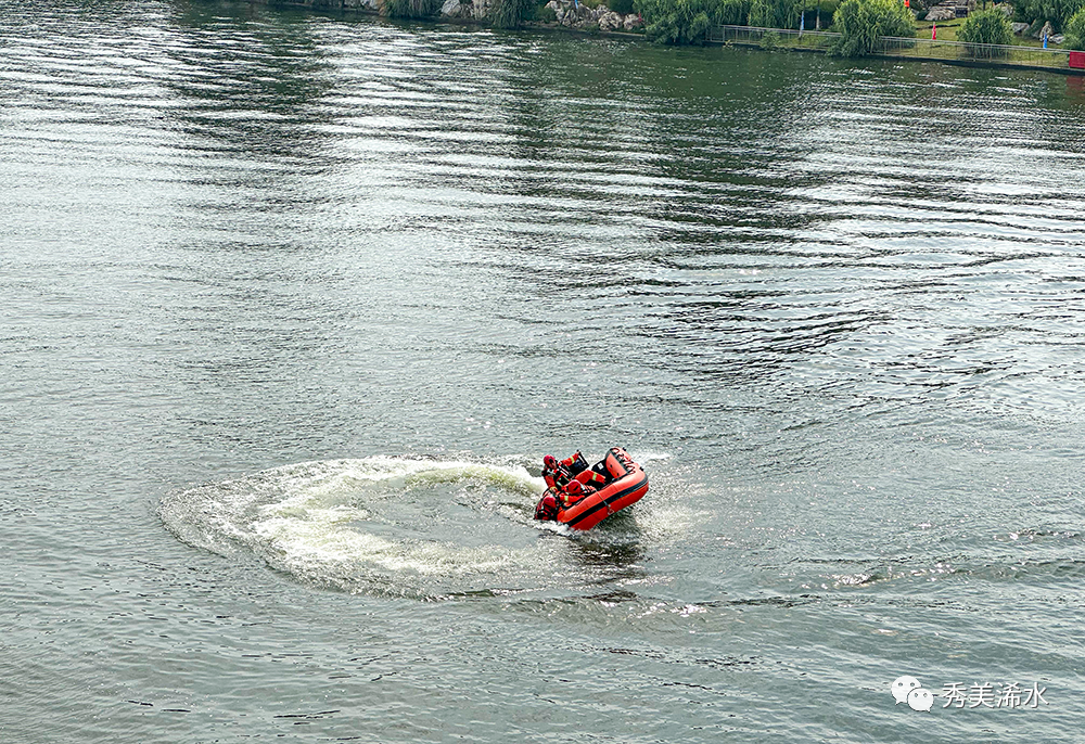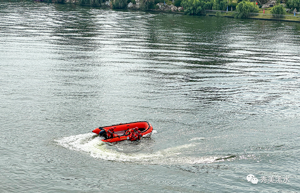 情况假定:困浠水河水位上涨迅速,水势凶猛,救援人员到达指定水域后发现了2名漂浮在水面上的落水人员,即将被水冲到浠水河映水桥水域,急需救援。指挥部立即命令县消防救援大队实施水上救援行动。演练内容:利用充气式动力救生艇,采用“O”型快速救援方式进行救援。