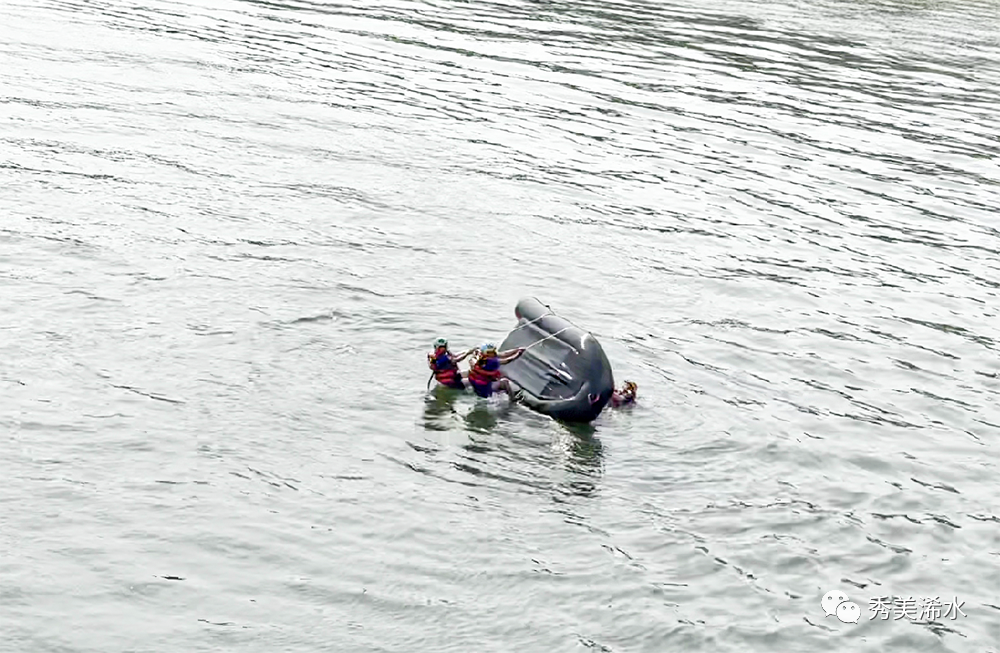 情况假定:救援队员在执行搜救任务时突遇激流,橡皮艇不慎侧翻,队员全部落水。落水的救援人员相互配合进行自救。