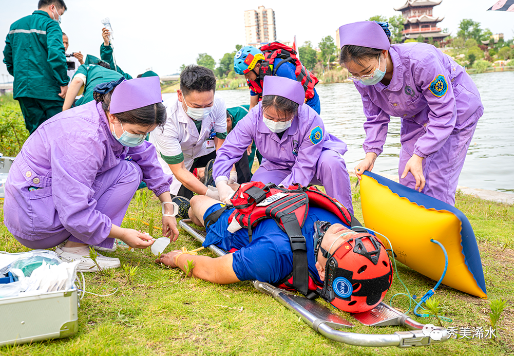 情况假定:2名落水群众被救起后,1名溺水昏迷、1名腿部被割伤,需紧急送往医院救治。演练内容:调度救护车出警,现场急救,用担架抬上救护车送往医院救治。