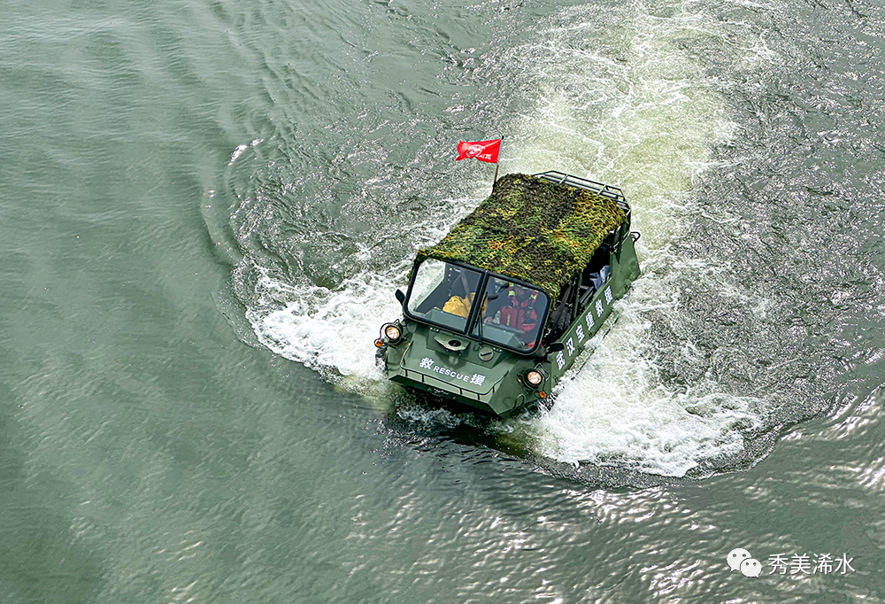 情况假定:9时30分,由于强降雨,上游一处山体发生大方量滑坡,数名群众被困,现场道路损毁,救援车辆无法到达。接到报告后,县防指立即派出救援队,驾驶多功能全地形水陆两栖车,迅速前往该区域,将被困者转移到安全地带。演练内容:利用全地形水陆两栖车救援被困者。