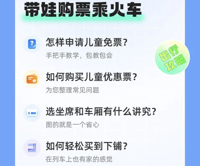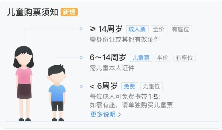注意:免费乘车的儿童,如需单独使用席位,应购买儿童优惠票。