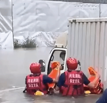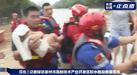 抱着受困婴儿蹚过齐膝积水平稳转移至安全位置