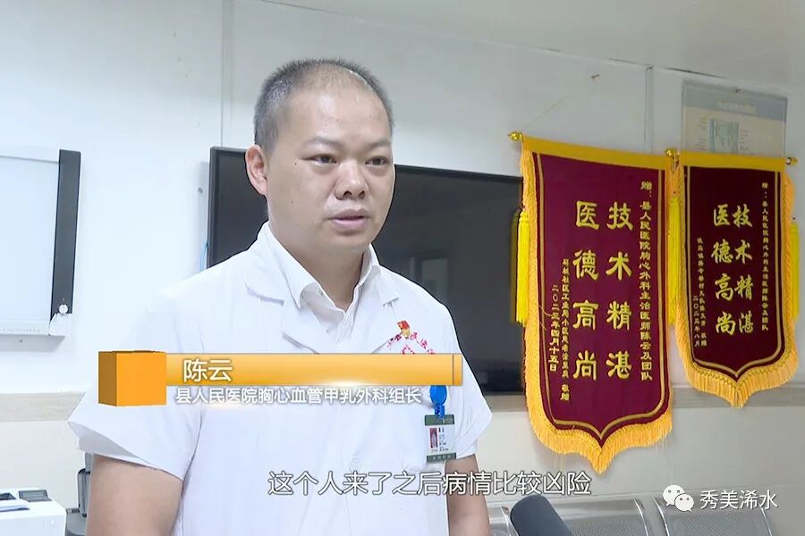 县人民医院胸心血管甲乳外科组长 陈云:这个人来了之后病情比较凶险,呼吸困难,面色紫绀,烦躁,大汗,有严重的综合感染,如果说得不到及时救治的话,可能随时都有生命危险。