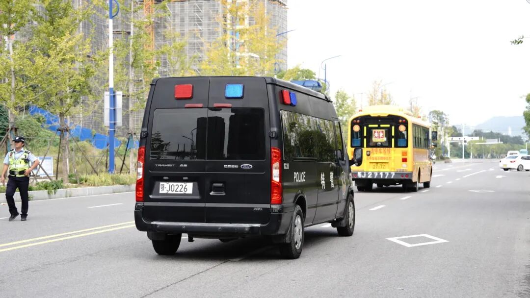 一辆校车行驶至揽月路黄龙港站停车接学生,5名学生陆续上车后,车辆前方突然出现一名“可疑男子”,手持“凶器”冲向目标校车。随车照管员发现后马上上车,驾驶员迅速关闭车门,照管员大声呼喊提醒所有学生在座位上坐好并迅速锁好所有车窗,拨打110报警,安抚学生情绪。
