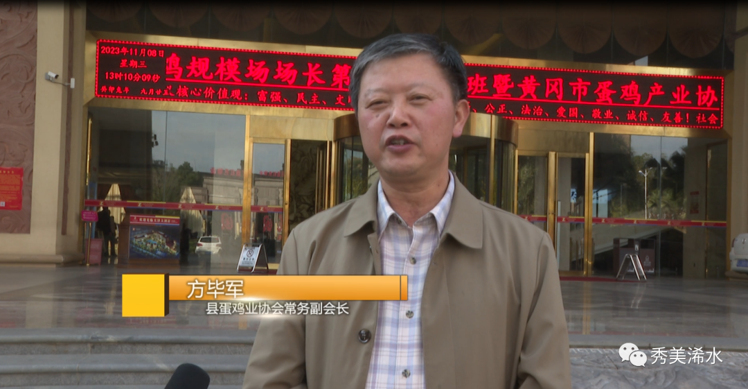 浠水县蛋鸡业协会常务副会长 方毕军:我们蛋鸡协会围绕浠水的一个蛋鸡发展,今年搞了五期培训班,总共培训了100多人,为浠水的蛋鸡养殖提供人才和技术支撑。
