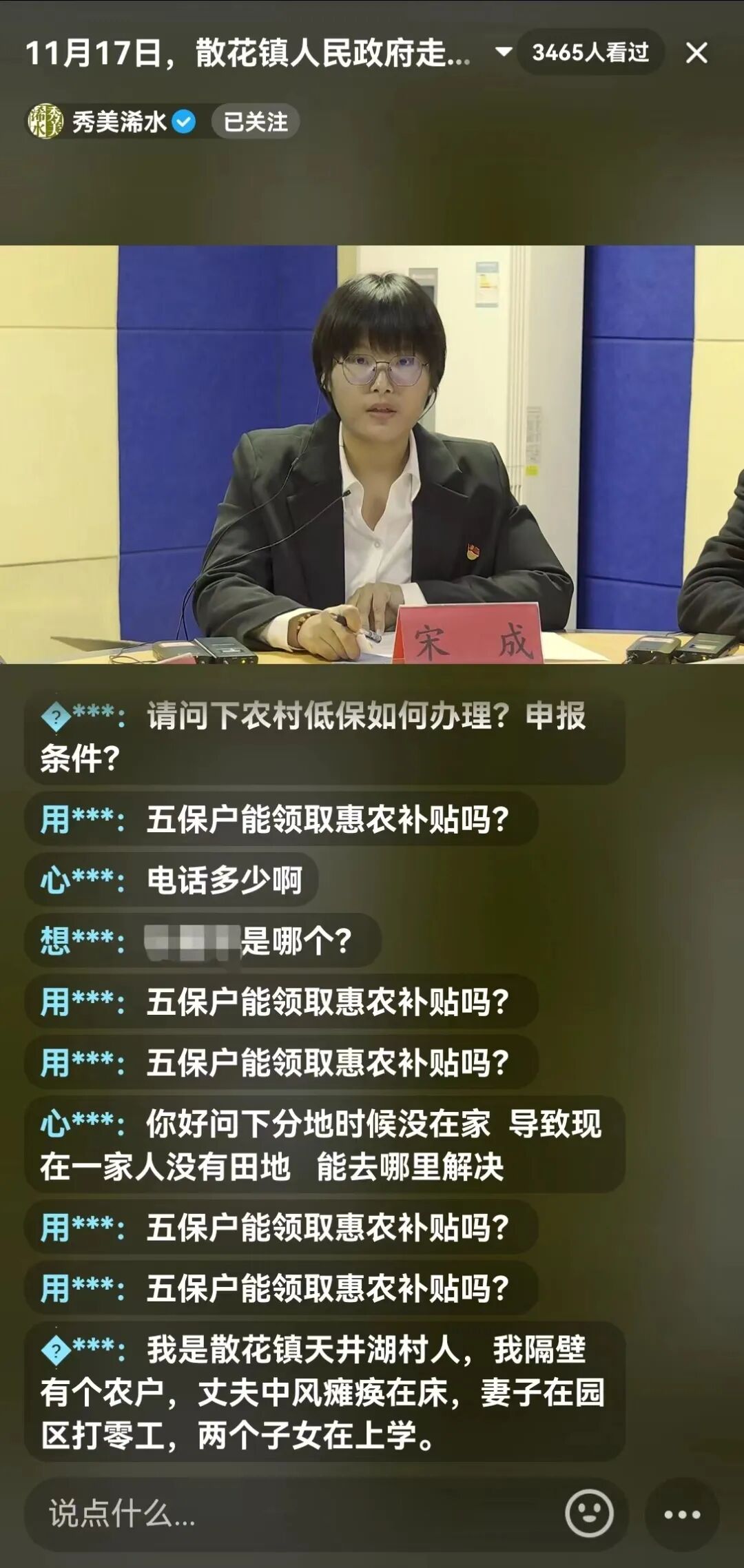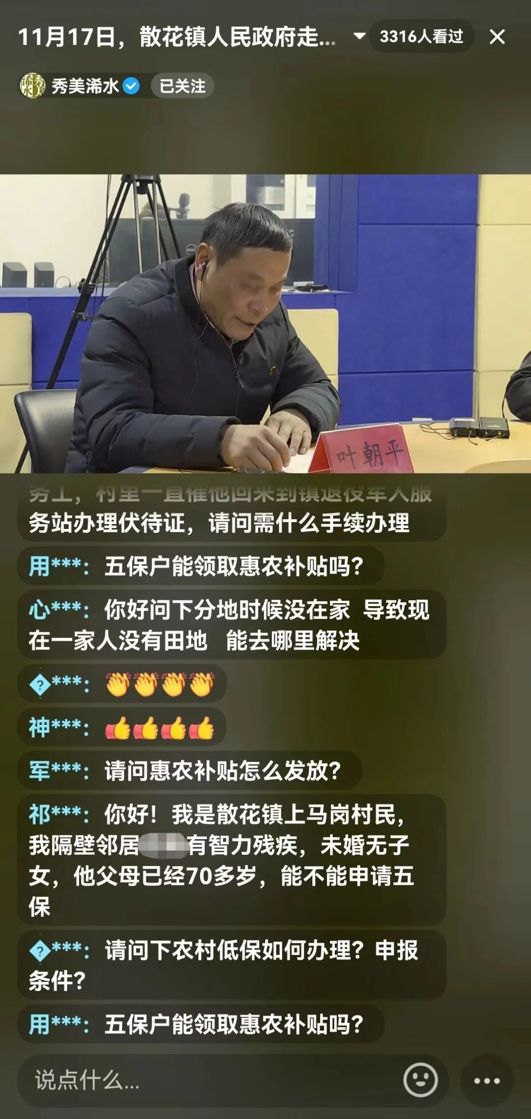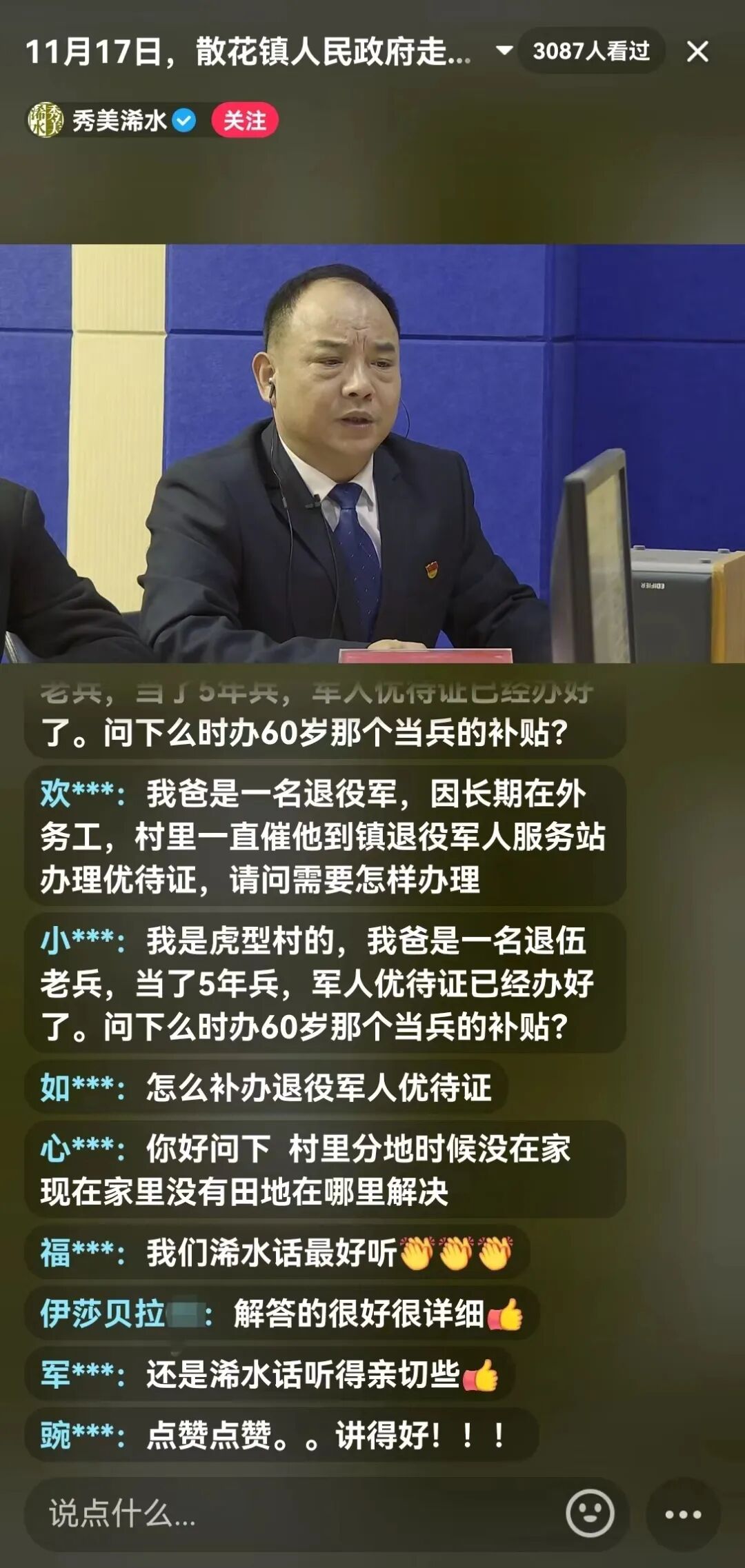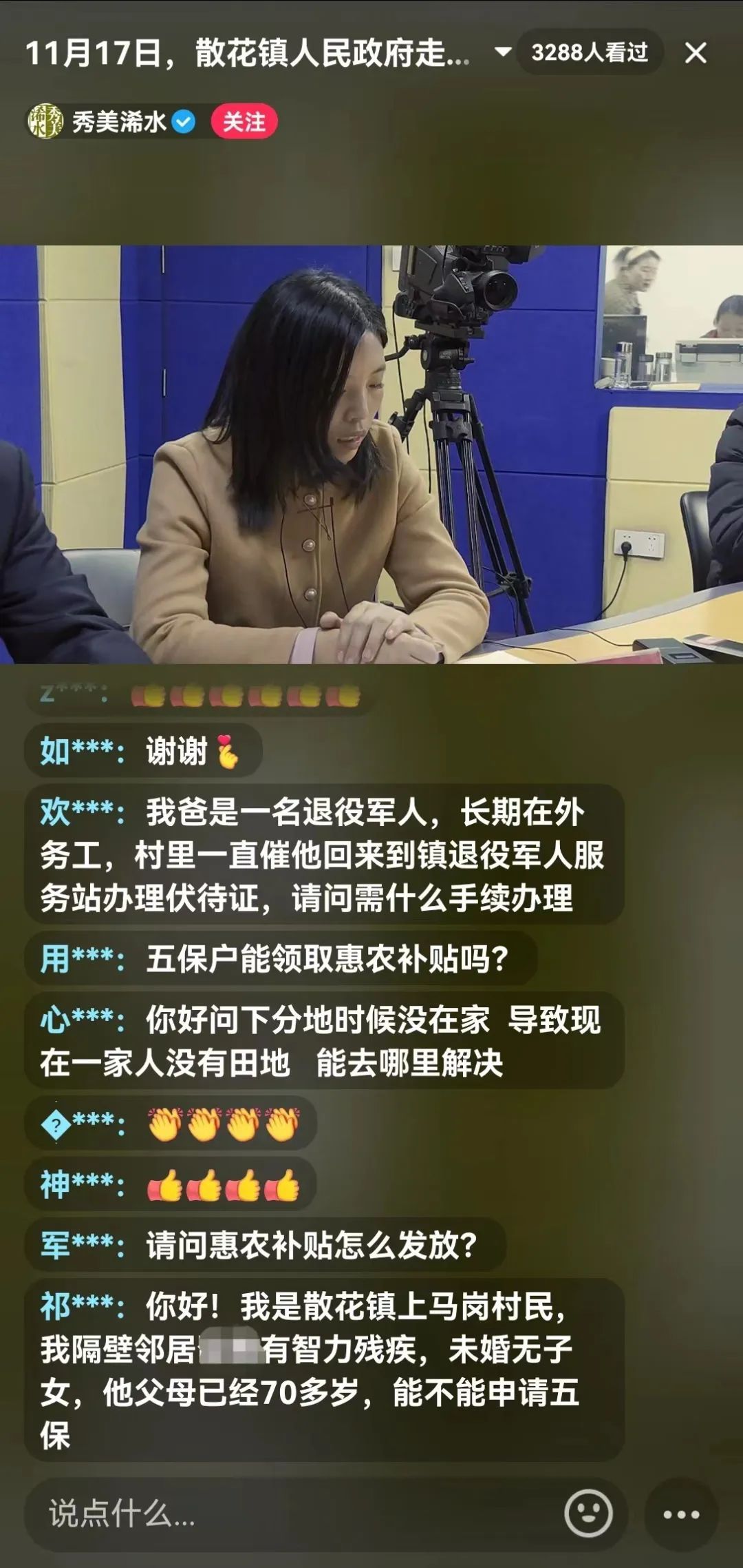 直播开始时,散花镇有关负责人全面介绍了散花政府工作开展情况,诚恳欢迎广大居民朋友、网友对散花镇工作积极建言献策,多提宝贵意见。在一个小时的节目中,热线电话不断,广大居民朋友纷纷打进电话,就道路刷黑、惠农补贴、农村低保、异地住院、退役军人优待证补办以及耕地补贴等问题打进了10多个咨询电话。直播间中,热线听众就自己关心的事项积极提问发言,散花政府各相关业务部门负责人分别进行了详细作答,将有关政策同听众、网友们进行现场交流,以满腔热情和高度负责的态度对待热线群众反映的问题。通过此次直播节目,加强了散花政府与群众的交流沟通,为群众解决了一些生产、生活中遇到的实际困难和问题,同时,群众提出的意见和建议也将会帮助政府提升工作能力、改进工作作风,进一步拓宽了为民服务和接受监督的渠道。