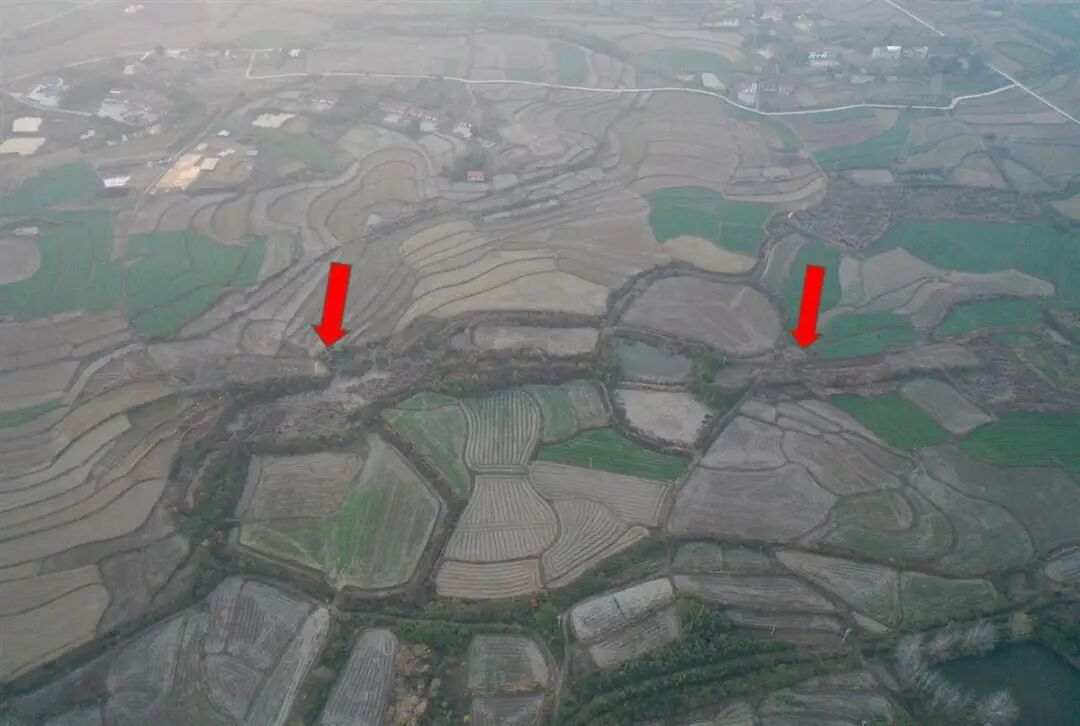 “水坝”遗存航拍(红色箭头部分)(城河遗址联合考古队供图)