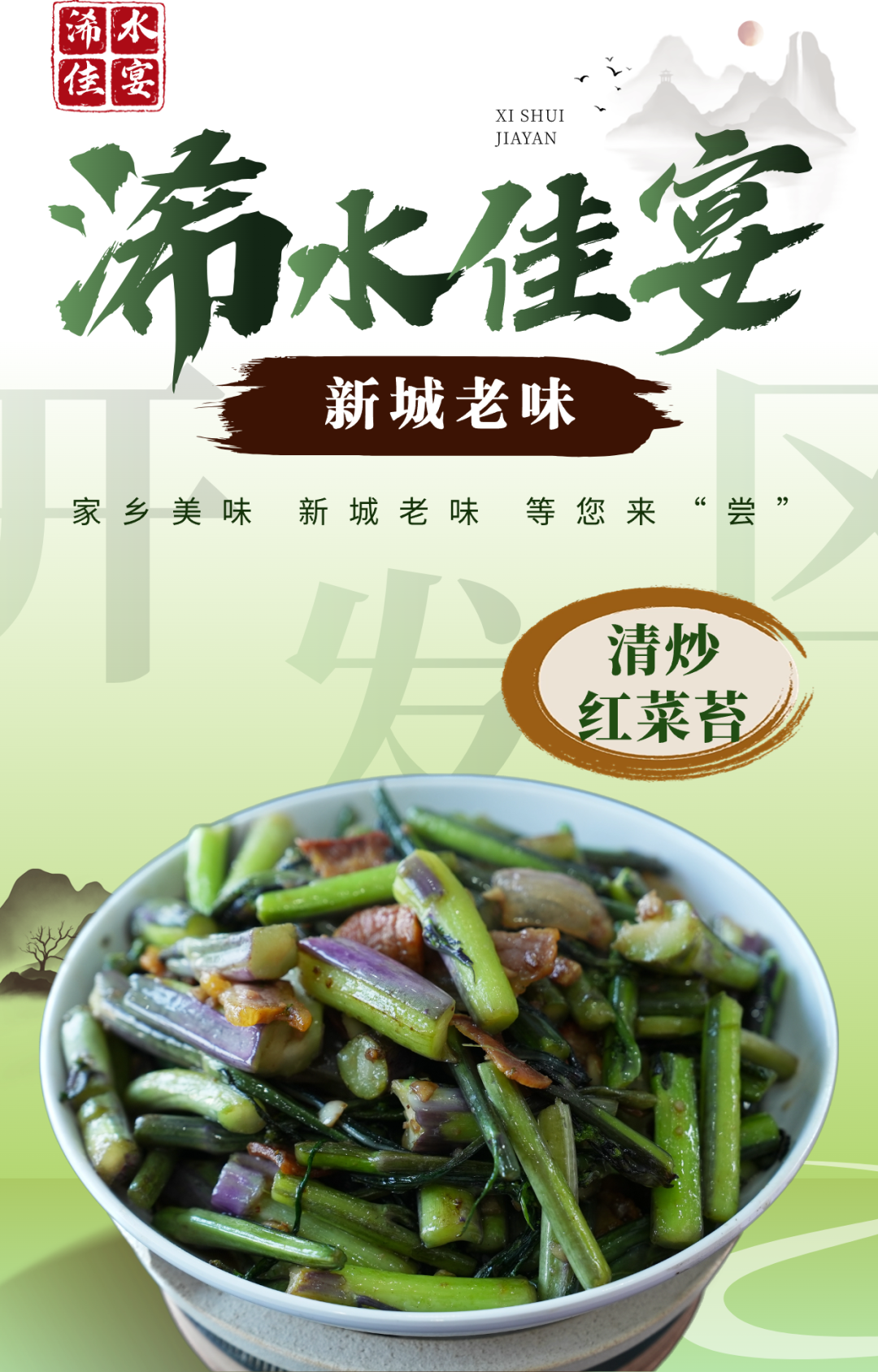菜品简介:选用农家肥种植的粗根菜苔,锅里放菜籽油加蒜倒入菜苔猛火炒至断生配味即可出锅,民间有“梅兰竹菊经霜翠,不及菜苔雪后娇”之说。