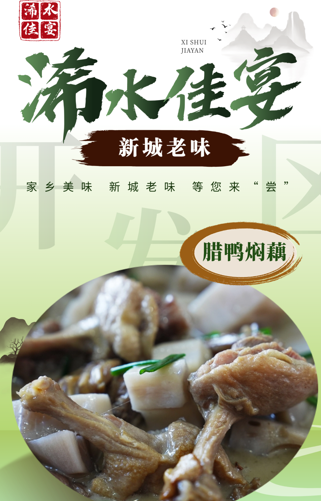 菜品简介:“腊鸭焖藕”,亦汤亦菜,选用农家散养两年的鸭子入冬腌制风干,再搭配上粉粉面面的芦河莲藕制作出来的。腊味的特色是“有味使之出,无味使之入”,而莲藕本性清净,味道清淡;腊鸭的味道却霸道醇厚,二者相配,莲藕吸足了腊鸭的咸鲜味道,汤喝起来不油不腻,不咸不稠。腊鸭风干过后,鸭肉呈诱人的红色,经过大自然时间的洗礼,散发着特殊的香味。