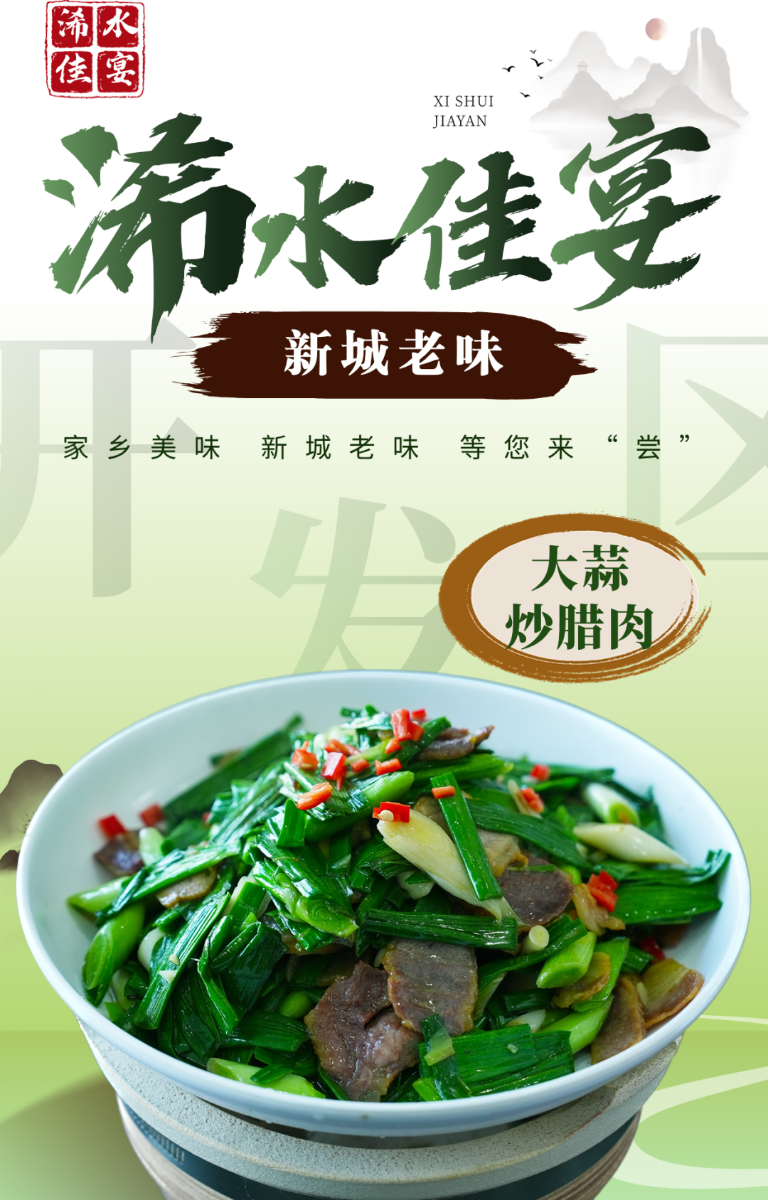 菜品简介:选用农家腌制风干黑土猪肉与本地红根香蒜,味道鲜美。大蒜与腊肉的巧妙结合,大蒜的阵阵香味与腊肉相互融合,大幅度增加菜肴的香味,而大蒜炒肉又把大蒜的药理作用发挥得淋漓尽致。