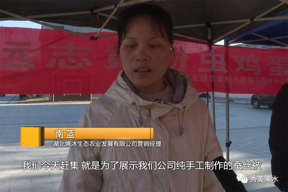 湖北锦沐生态农业发展有限公司营销经理 南蓝:我们今天赶集,就是为了展示我们公司纯手工制作的蚕丝被,我们隶属于汪岗村前进村,基于种桑养蚕手工被为一体的公司。