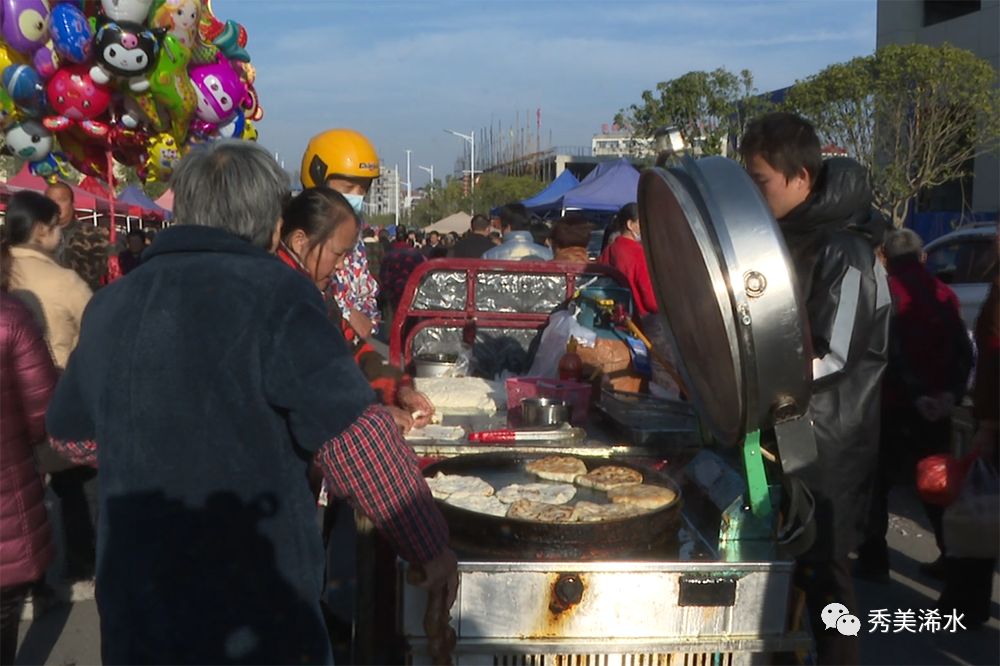 集市上商品种类繁多,新鲜果蔬、五谷杂粮、衣服鞋子、休闲小吃……吃穿用行样样兼具,并且价格实惠。摊位把街道摆了个满满当当,集市上,阿姨们挑拣摊上货品,与身旁顾客探讨衣物材质,又或是放身上比划大小,谈笑风生间,淘到最满意的一款。集市中,还有县农技协农产品展区,展示着黄粉虫鸡蛋、蚕丝被等本地产品。