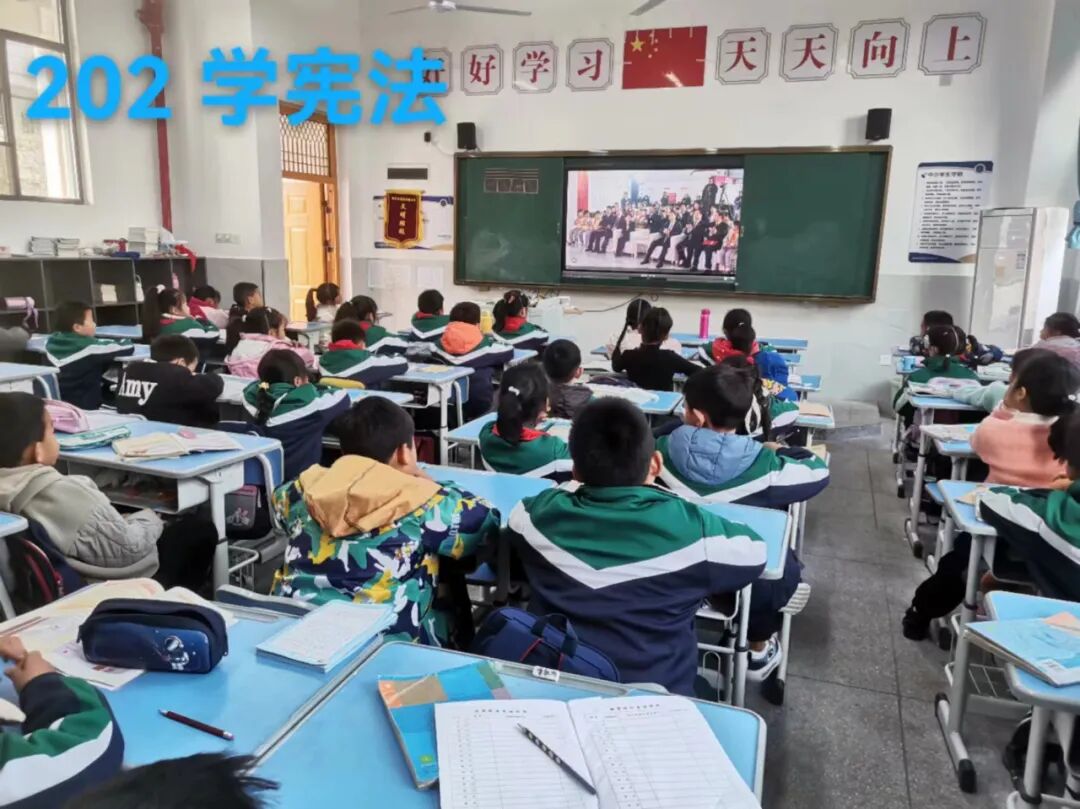 在青少年学生中组织开展参与度高、具有仪式感的宪法宣传活动,将宪法教育融入宪法晨读、主题班会、社团活动等,通过主题板报、演讲比赛等实践活动开展法治教育,推动法治副校长深入中小学集中开展宪法宣讲活动,培育青少年学生的宪法意识、国家意识、规则意识。图为散花小学在国家宪法日当天组织开展“宪法晨读”主题班会以及演讲等活动。