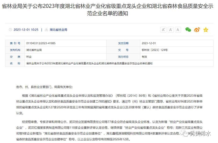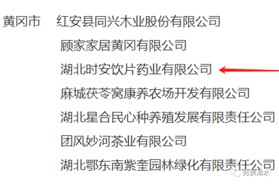 12月1日,省林业局公布2023年度“湖北省林业产业化省级重点龙头企业”和“湖北省森林食品质量安全示范企业”名单,浠水县清泉镇湖北时安饮片药业有限公司被认定为“林业产业化省级重点龙头企业”,进一步壮大了浠水县省级重点龙头企业队伍规模。