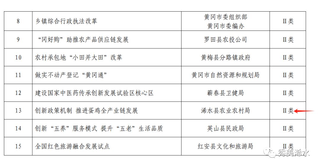 日前,中共黄冈市委全面深化改革委员会办公室印发通知,决定对“全域整县推进教联体改革”等5个改革项目,按 I 类改革项目标准,予以每个项目 20万元资金支持;对“打造政务 服务‘冈好办’品牌”等 10个项目,按Ⅱ类改革项目标准,予以每个项目10万元资金支持。其中,浠水蛋鸡全产业链改革项目被推选为优秀改革项目,并按Ⅱ类标准予以10万元资金支持。