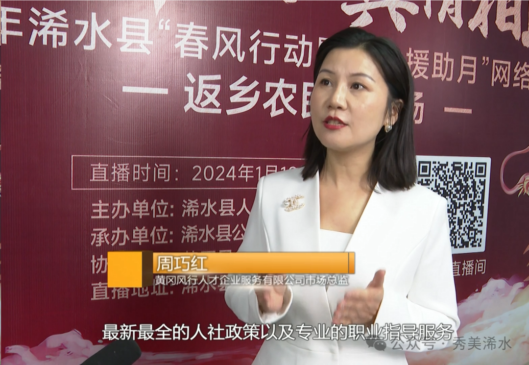 黄冈风行人才企业服务有限公司市场总监 周巧红:在这个直播间我们给大家带来了民企的岗位分享,最新最全的人社政策以及专业的职业指导服务,我们希望能够帮助直播间的求职的朋友们能够真正找到自己心仪的工作。