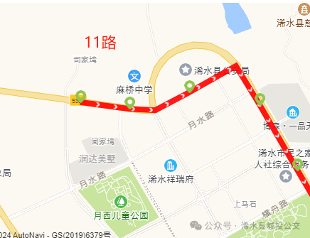 上行:月山—麻桥—拔炉山—气象局—新妇幼保健院—儿童乐园—润达美墅—祥瑞府小区—市民之家后门—市民之家—欧亚达家居——月湖小区——珑湖半岛—地方病医院—清泉派出所—老妇幼保健院—建设银行——都得利车站—康复医院—学堂路口—丽文广场—县政协委员会—文庙—文昌公园 下行:同上反向。 线路走向图如下: