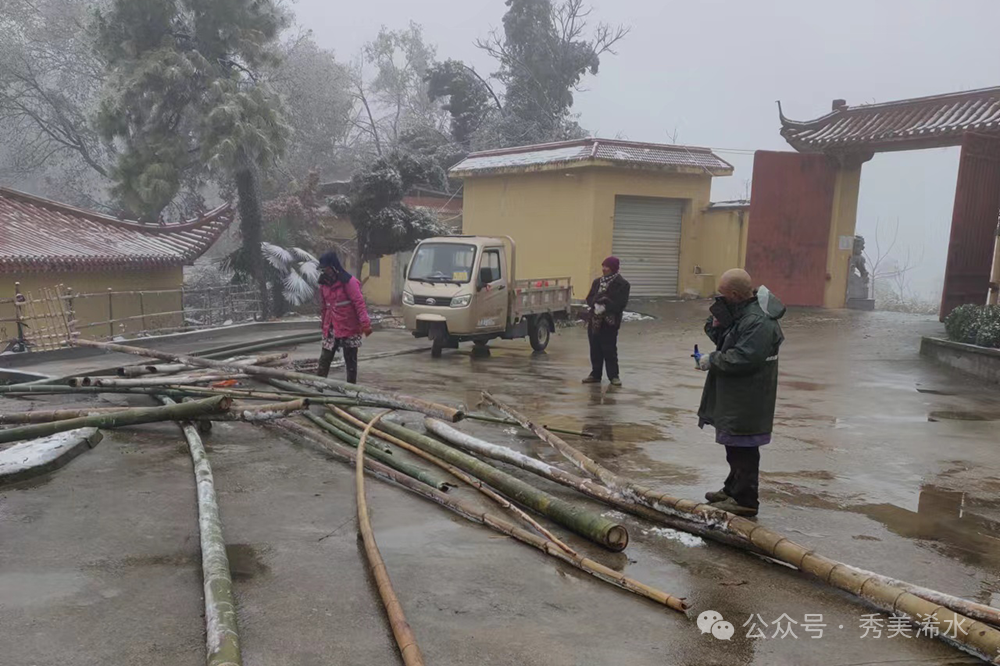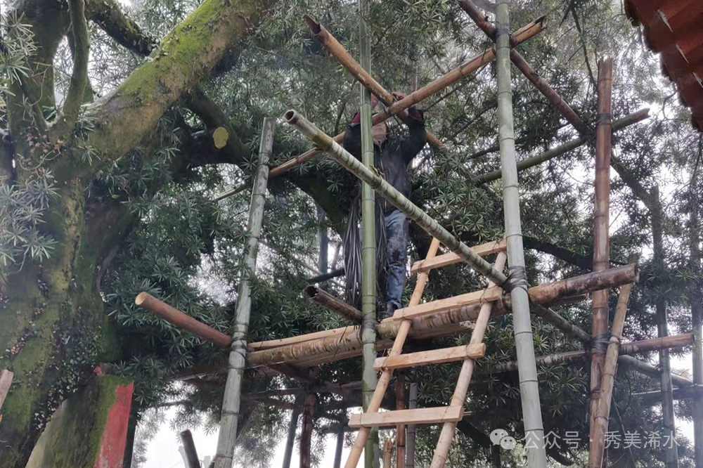 通过为古树升温融冰、搭建支架,历时二十多个小时完成了对古树的临时抢救性加固工作,并对部分结冰严重的古树名木实施人工除冰减少负重,确保古树名木顺利越冬。