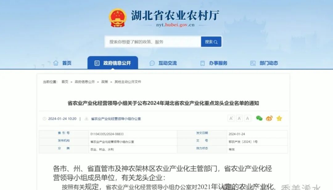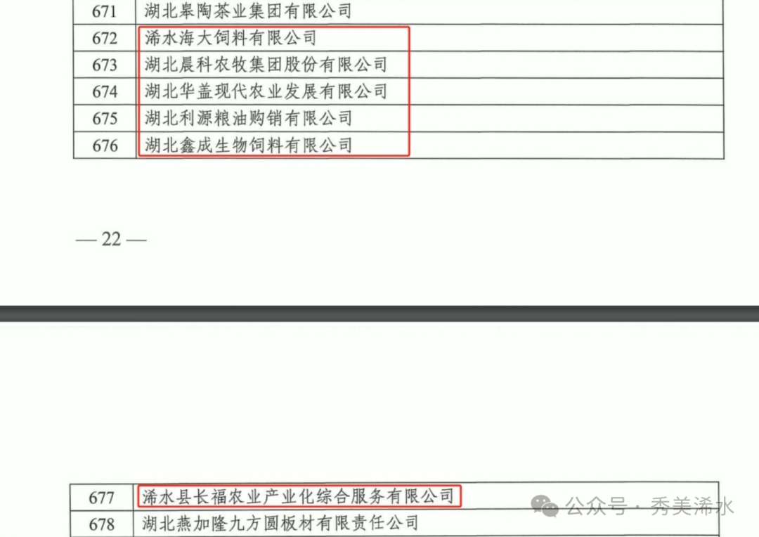 近日,省农业产业化经营领导小组办公室公布2024年湖北省农业产业化重点龙头企业名单。全省901家企业监测合格,保留农业产业化省级重点龙头企业称号;87家企业符合条件,递补为农业产业化省级重点龙头企业。其中,我县6家单位监测合格上榜湖北省农业产业化重点龙头企业名单,分别是浠水海大饲料有限公司、湖北晨科农牧集团股份有限公司、湖北华盖现代农业发展有限公司、湖北利源粮油购销有限公司、湖北鑫成生物饲料有限公司、浠水县长福农业产业化综合服务有限公司。