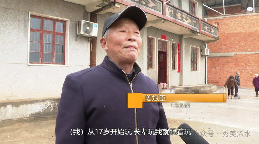 舞狮队员 姜斌臣:我从17岁开始玩,长辈玩我就跟着玩,今年86岁,舞狮是以前老人传下来的。