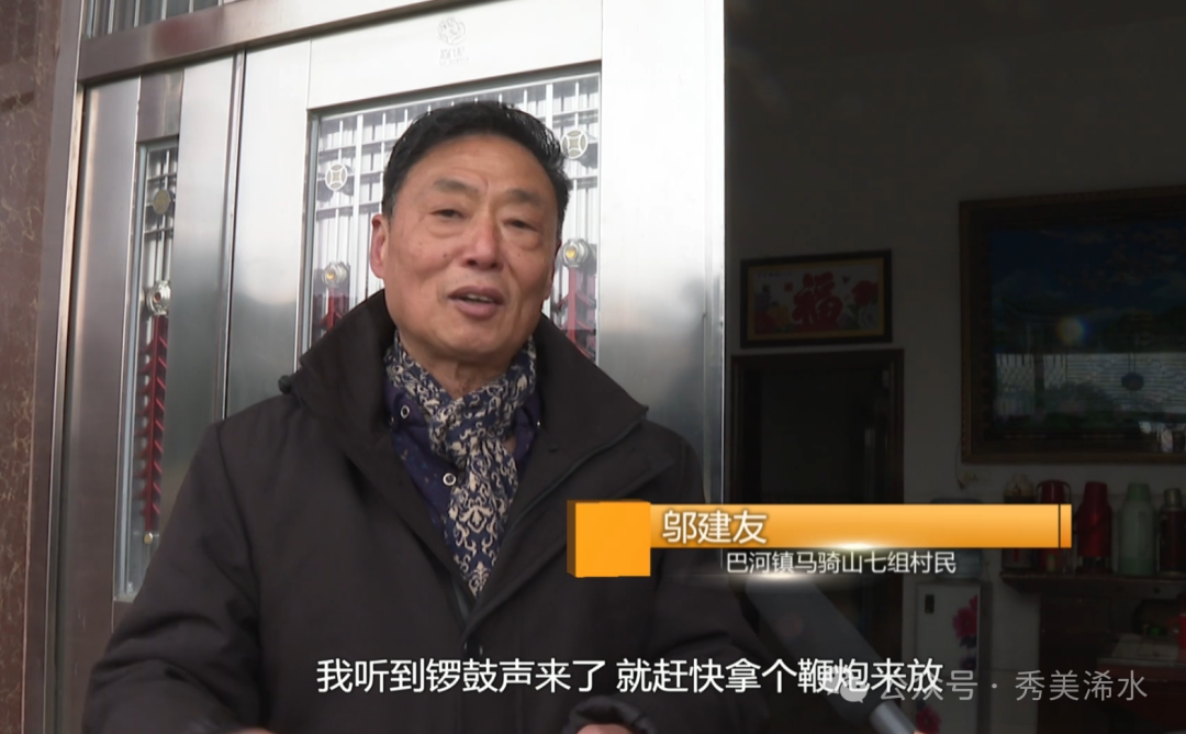 巴河镇马骑山七组村民 邬建友:我听到锣鼓声来了,就赶快拿个鞭炮来放,放了之后给块红布他们,他们再给块红布我,是互相尊重的意思,祝福双方顺遂发财,家家万事顺利,这是老风俗老传统。