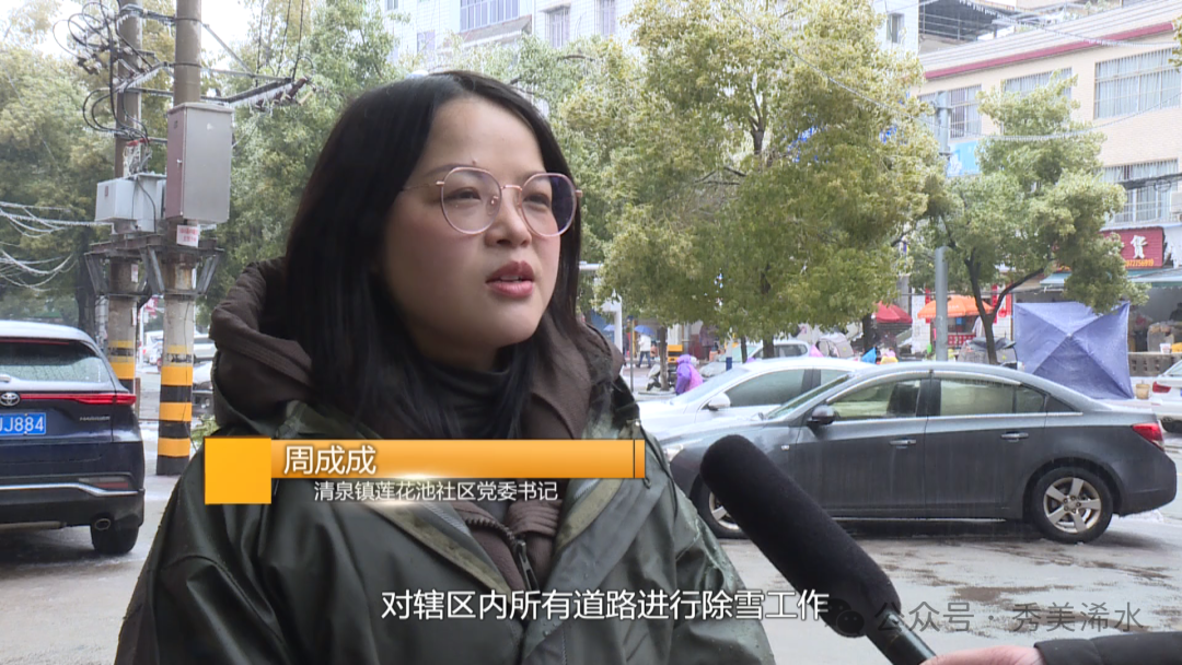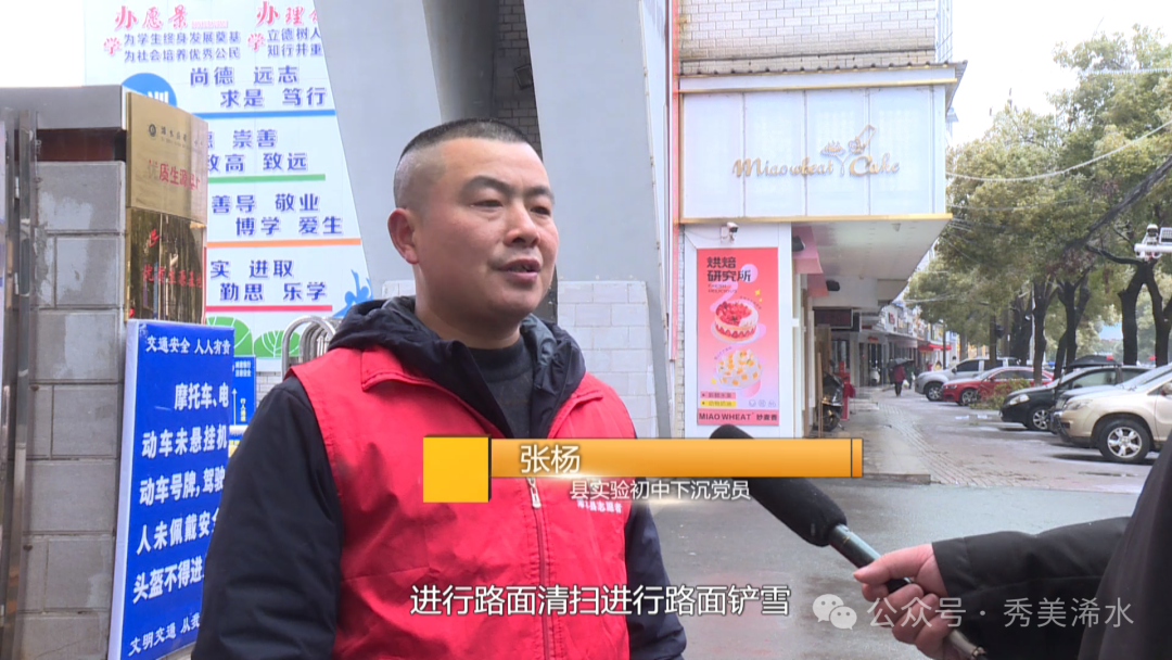 县实验初中下沉党员 张杨:昨天下雪到今天路面积雪比较厚,今天我们单位组织了八名党员,进行路面清扫铲雪,铲了两个多小时,现在路面基本畅通。