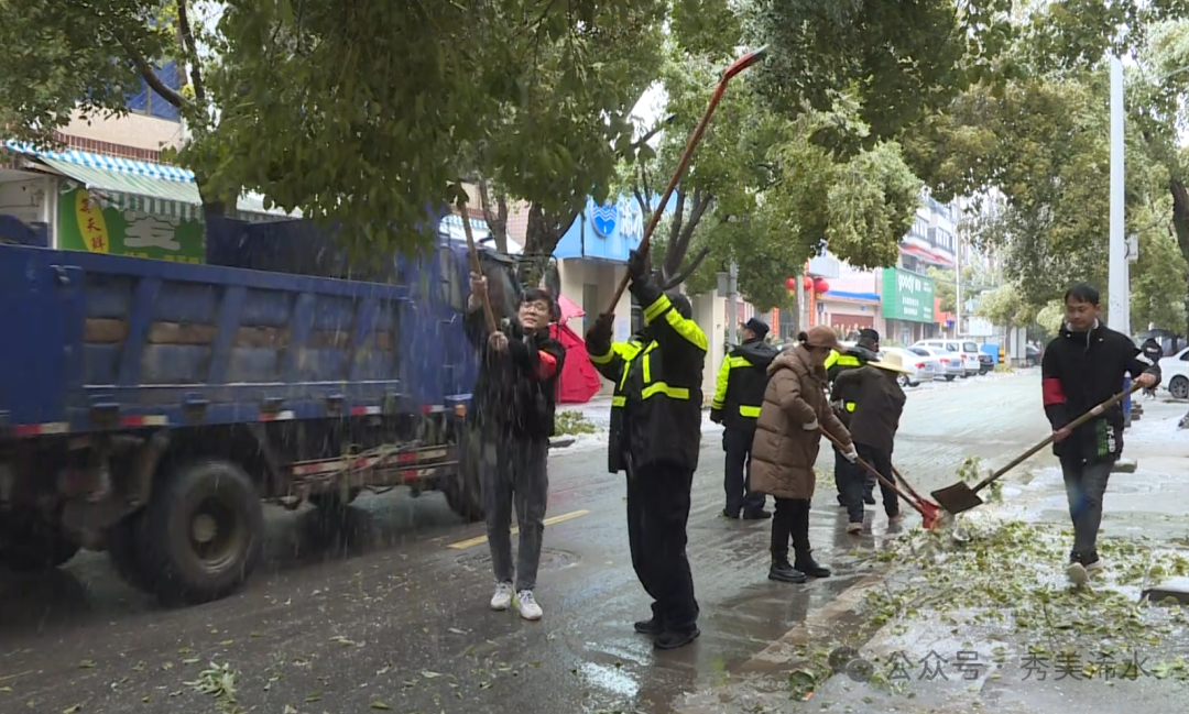 在清泉镇学堂路、十字横街等地,莲花池社区大党委组织县实验初中、县园林所40余名下沉党员,上路铲雪除雪,清理路面倒塌树木、枝丫。