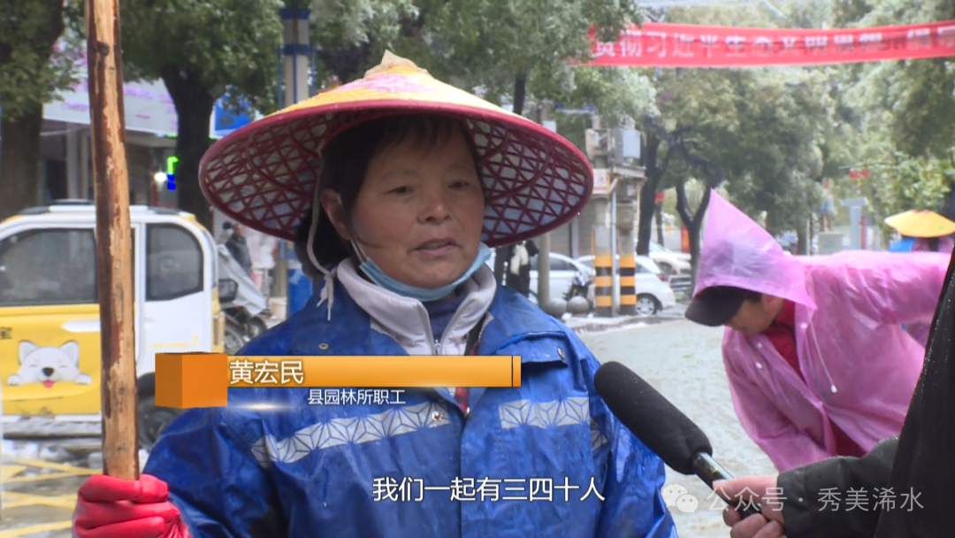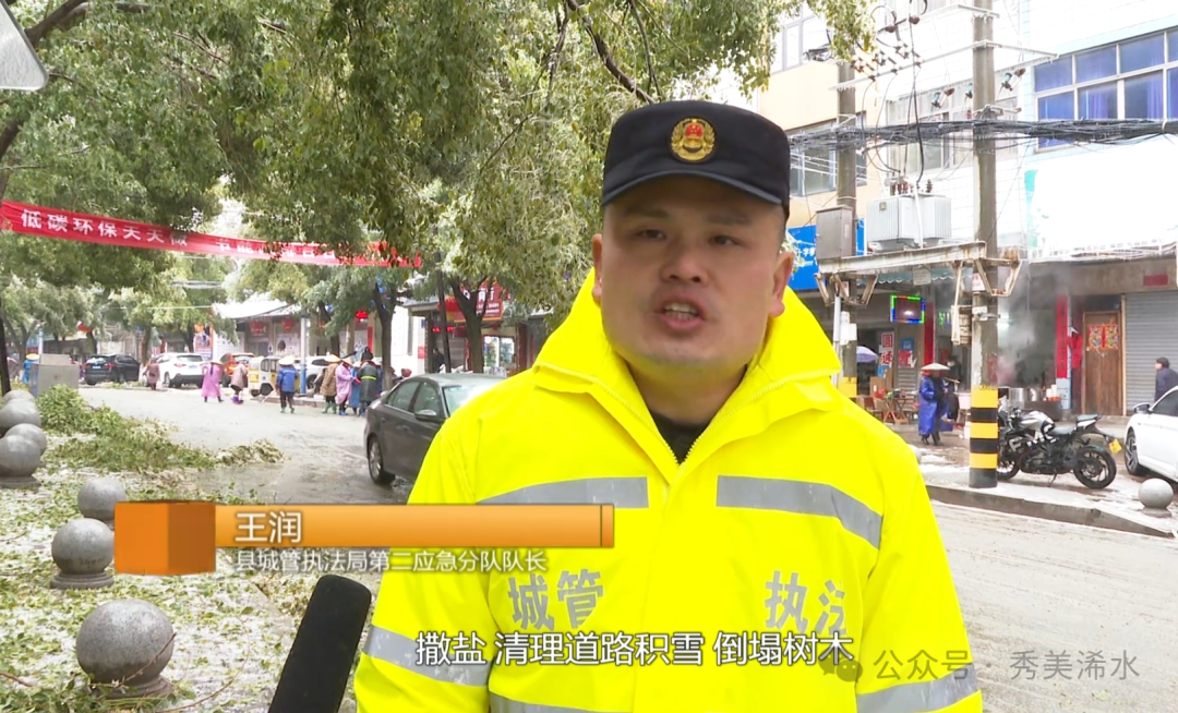 县城管执法局第二应急分队队长 王润:从昨天晚上接到通知后,我们全员上阵,通宵达旦奋战在一线,撒盐、清理道路积雪、倒塌树木,确保道路畅通。