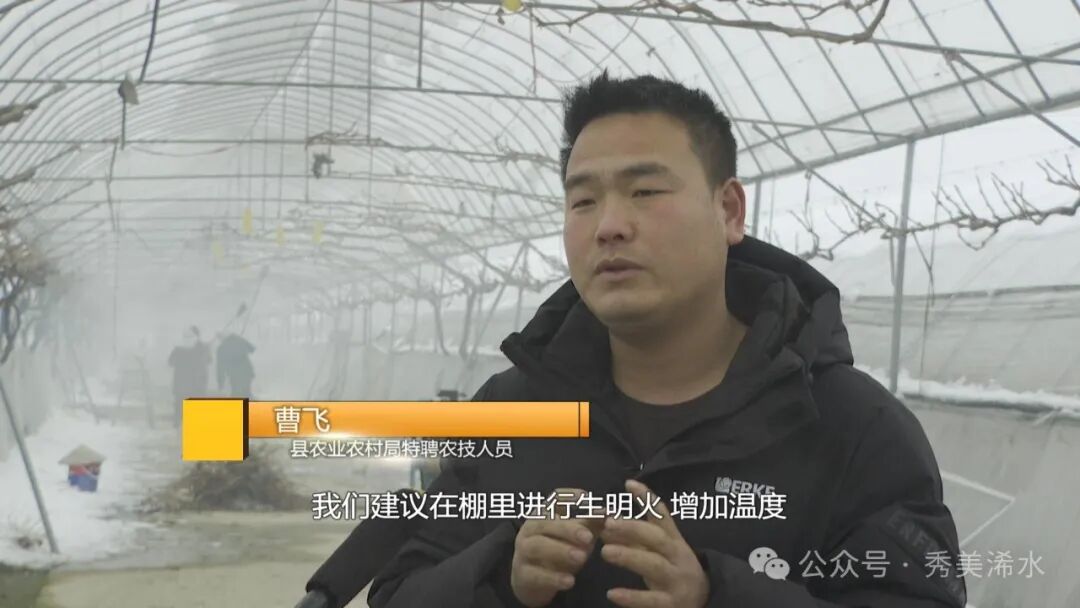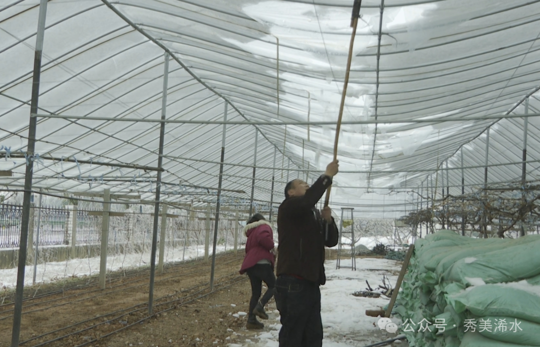 县农业农村局特聘农技人员 曹飞:如果我们的棚四周都围起来了、都包裹得挺严实、有保温措施,我们建议在棚里进行生明火,增加温度,让棚顶的雪融化掉,有些棚四周没有包起来,没有保温措施,我们只用通过人工除雪的措施,把冰捅下来。