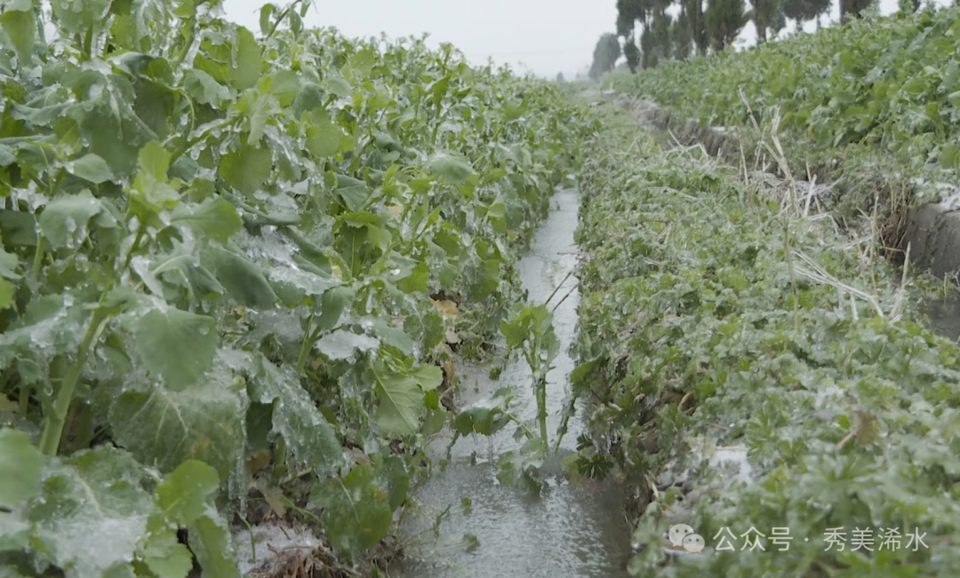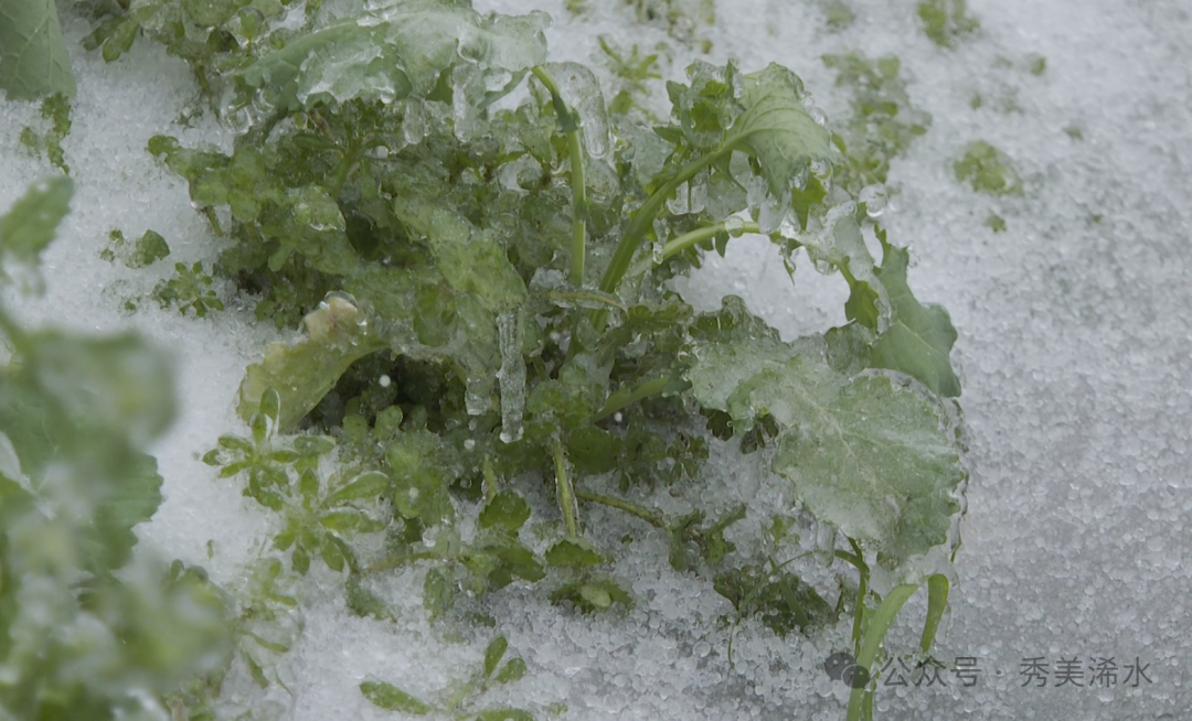 一夜之间,全县农作物,全都覆盖了厚厚的冰雪,记者今天上午采访时,冻雨还在持续。全县种植的40万亩油菜,目前处于现蕾至抽薹期,耐寒性下降,此次冻雨导致油菜出现低温冻害情况。
