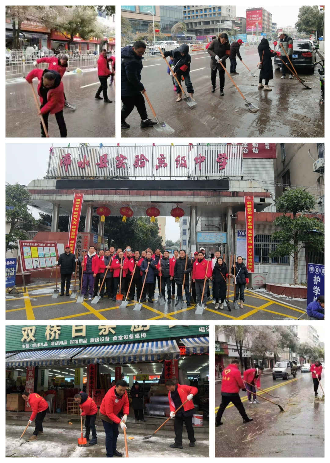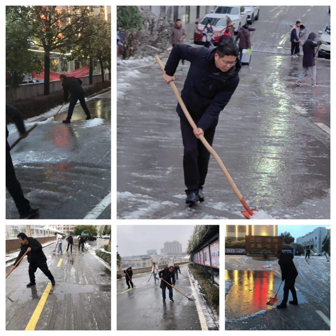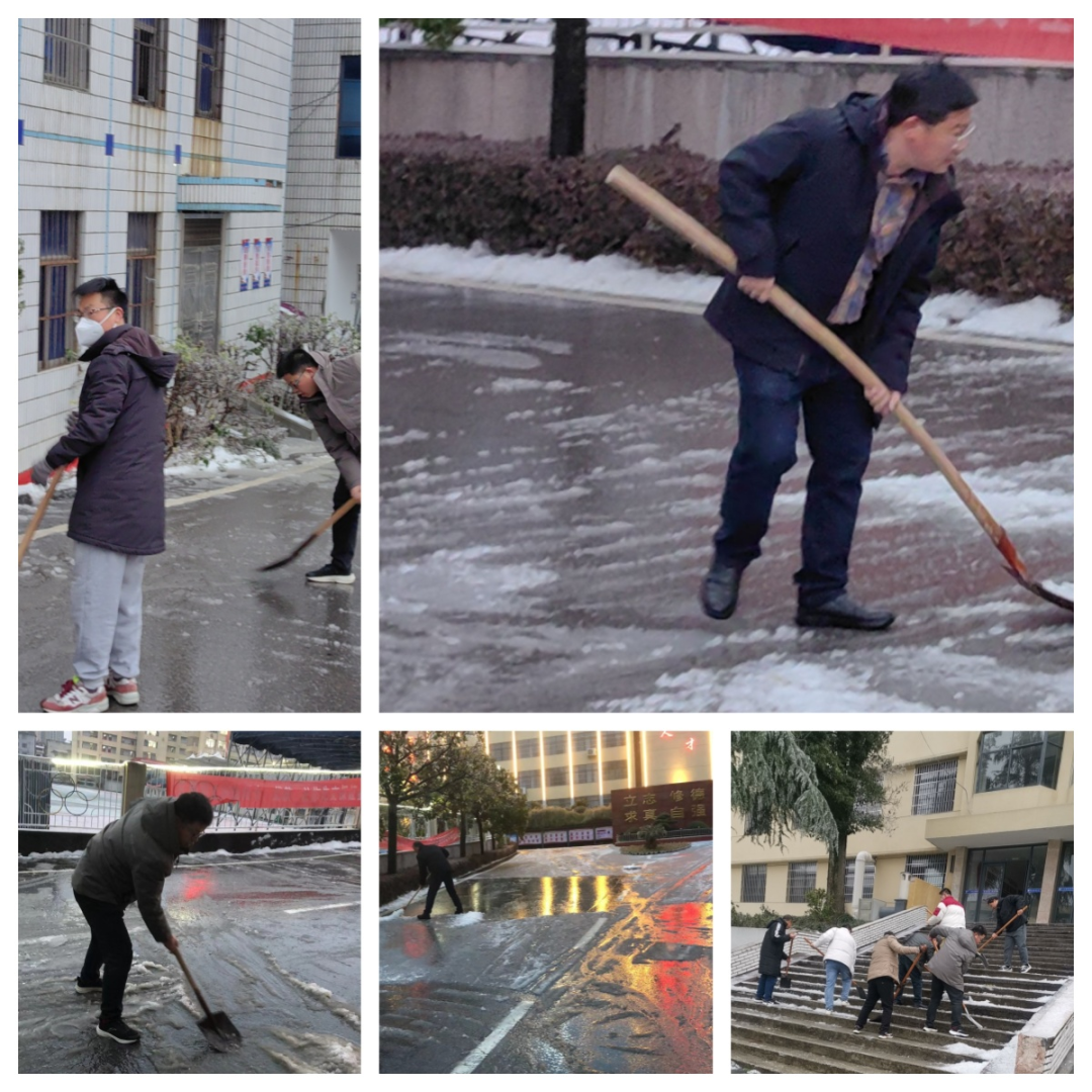 在校老师们在校领导的带领下迅速行动起来,拿起除雪工具,参与到战斗中来。他们的身影在雪地中穿梭,挥舞着铁铲,用力地铲除道路上的积雪和冰块。
