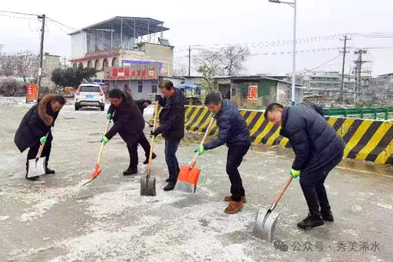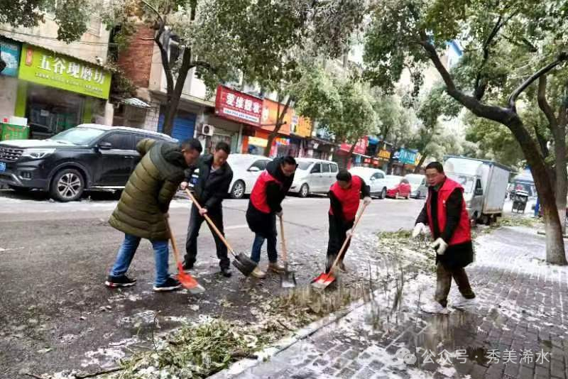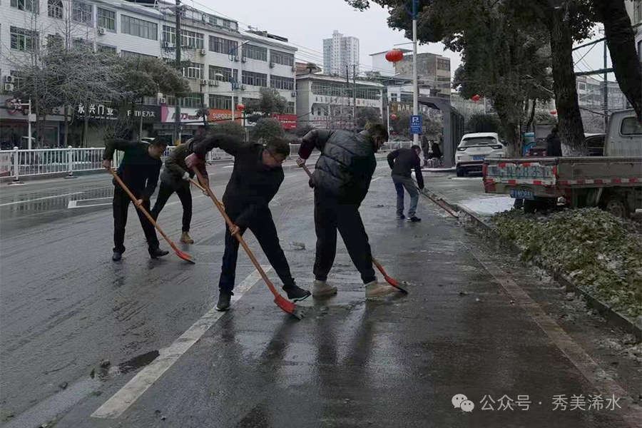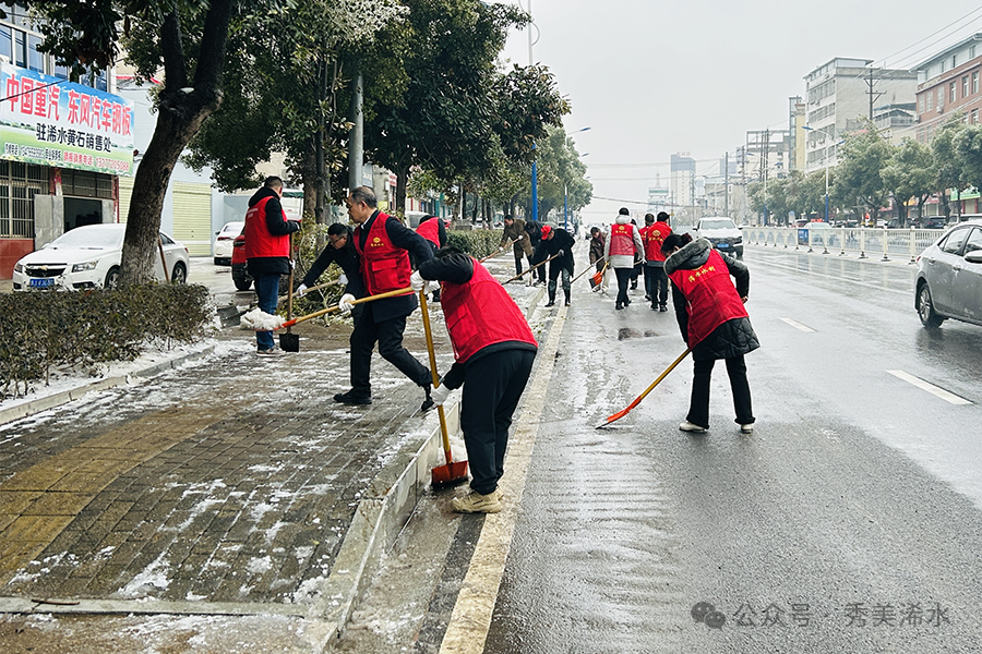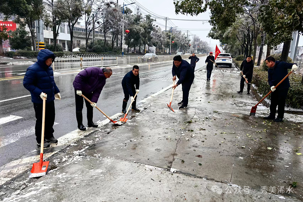▲在闻一多大道体育馆至冠桥学校路段,县财政局组织20人应急小分队上路除雪,保障道路畅通。