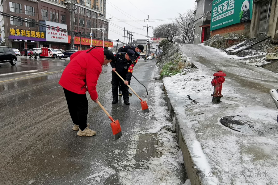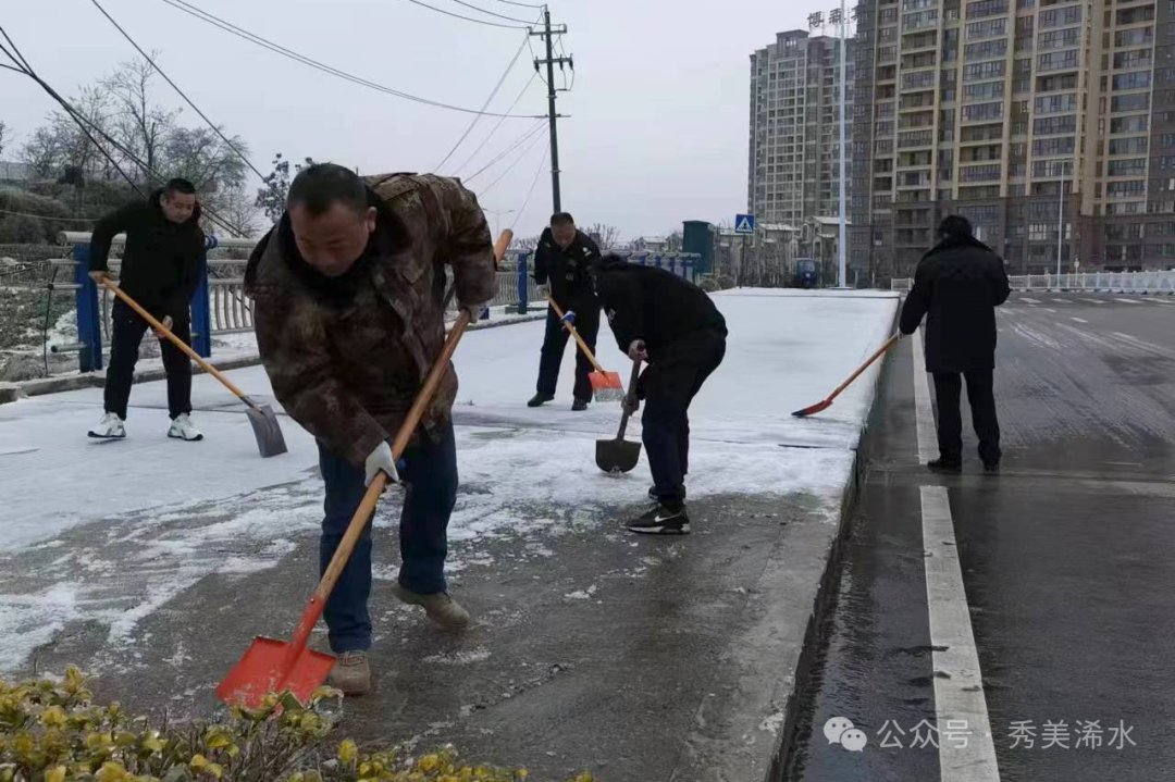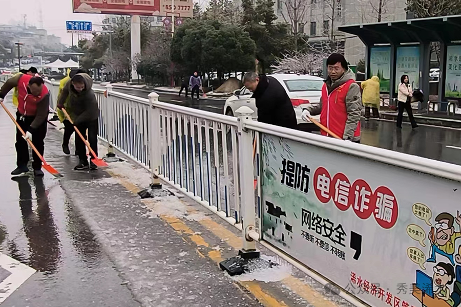 ▲在车站大道四级电站至三桥底路段,县卫健局组织50人对包保路段铲冰。