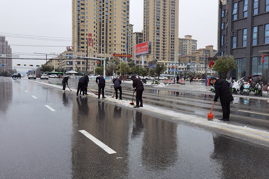 ▲在彩虹大道麻桥加油站至思源学校路段,县市场监督管理局针对恒凯国际段中线有少许积雪结冰问题,县市场监管局再次组织40余人进行清扫,保持道路畅通。